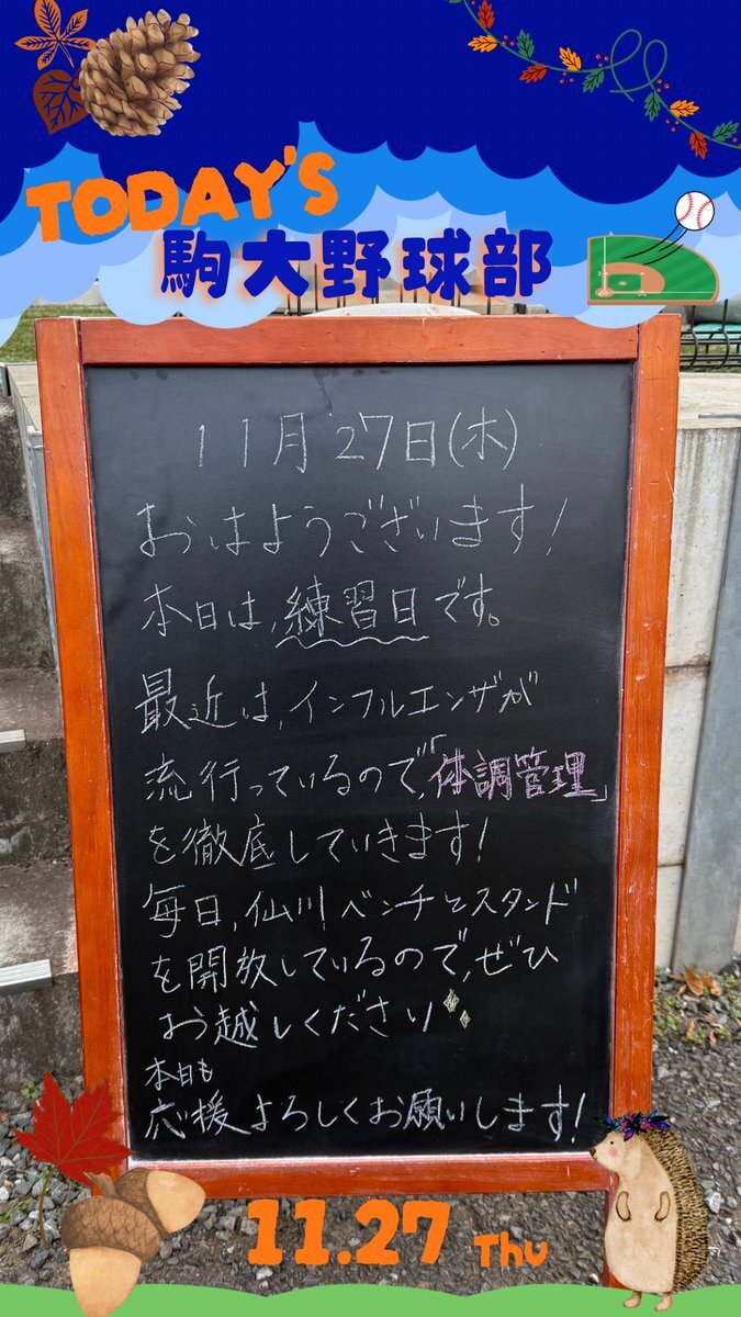 【今日の駒大野球部】 11月27日(木) 天気:☀️ 今日も練習頑張ります🔥 応援よろしくお願いします! #駒澤大学硬式野球部 #駒澤大学 #駒大野球部 #東都大学野球 #今日の駒大野球部 pic.x.com/jEx1qwlpM5