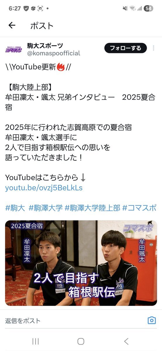 \\YouTube更新🔥// 【駒大陸上部】 牟田凜太・颯太 兄弟インタビュー 2025夏合宿 2025年に行われた志賀高原での夏合宿 牟田凜太・颯太選手に 2人で目指す箱根駅伝への思いを 語っていただきました! YouTubeはこちらから⬇️ youtu.be/ovzj5BeLkLs #駒大 #駒澤大学 #駒澤大学陸上部 #コマスポ pic.x.com/PbWkcQceXu