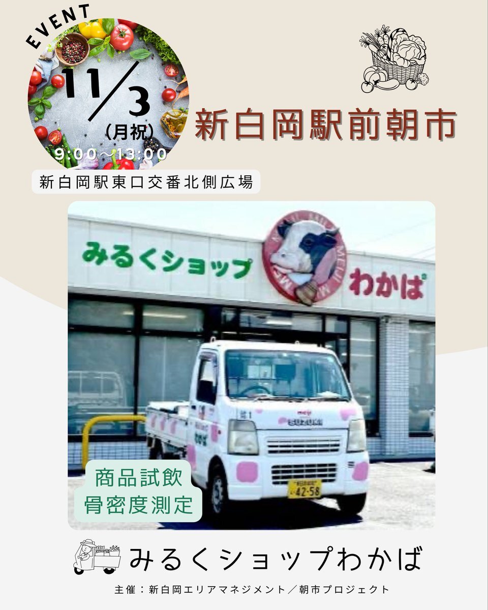 🥛出店者紹介🥛 みるくショップわかば 骨密度測定&meiji乳製品の試飲を実施!🦴🥛 朝から健康チェック&おいしいミルク体験を✨ #新白岡駅前朝市 #みるくショップわかば #骨密度測定 #明治乳製品 #健康習慣 #新白岡エリアマネジメント pic.x.com/AyJCO0OTRM