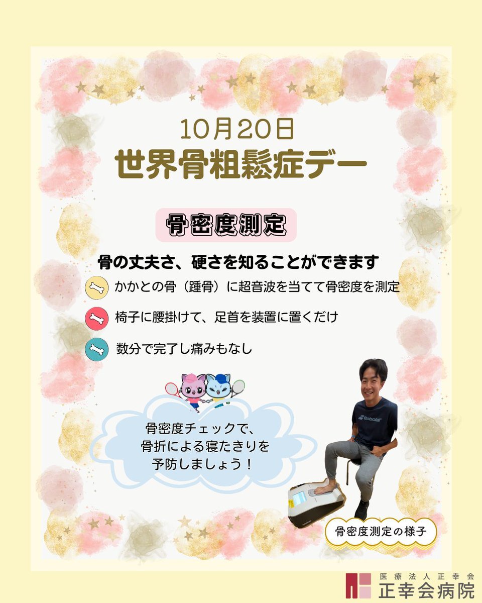 10月20日は #世界骨粗鬆症デー #骨粗鬆症 は骨がもろくなり、骨折しやすくなる病気です。 こんな症状はありませんか? ・背中が曲がってきた ・背中や腰の痛み ・極端なダイエット経験 当院でも #骨密度測定 を行っておりますので、お気軽にご相談ください🎵 pic.x.com/vHcTjk8enu