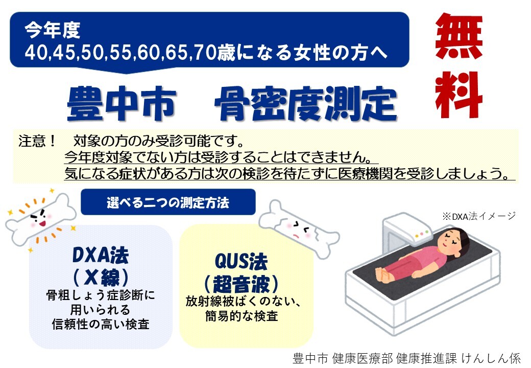 【女性の皆様 #5年に1回のチャンス#骨密度測定 を受けましょう!豊中市民の40歳~70歳までの節目年齢の女性は #無料 で受診できます。対象の方で受診希望の方は3月までに必ず受診してください。定期的な骨密度測定で骨粗しょう症を予防するカメ!医療機関リストはこちらcity.toyonaka.osaka.jp/kenko/kenko_ho… pic.x.com/eEAe96Ok1r