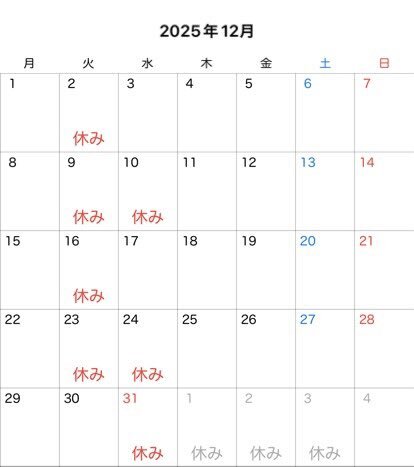2025年12月の定休日のご案内です。 2日、9日、10日、16日、23日、24日、31日はお休みとなります。 ※営業時間は9:00〜19:00となりますが、事前にご連絡をいただいている場合は21:00まで営業いたします😄 #虹リス整体院 #虹リス #カイロプラクティック #整体 #骨格調整 #骨盤矯正 #新所沢 pic.x.com/xnatnCXL8i