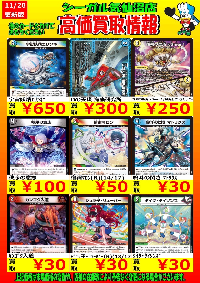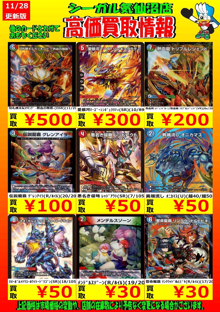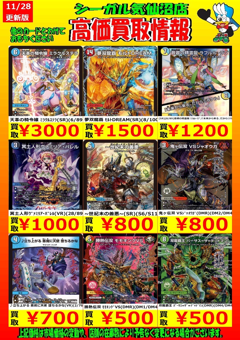 🔴12月1日までの期間限定🔴 高価買取中! お待ちしております!! 天革の騎令嬢 ミラクルステラ(SR) ¥3,000 夢双龍覇 モルトDREAM(SR) ¥1,500 *商品の状態や、在庫状況により 減額の可能性があり、表示価格の 適用外となる場合があります。 #シーガル気仙沼店 #デュエルマスターズ #高価買取 pic.x.com/pu3nxLc0tp
