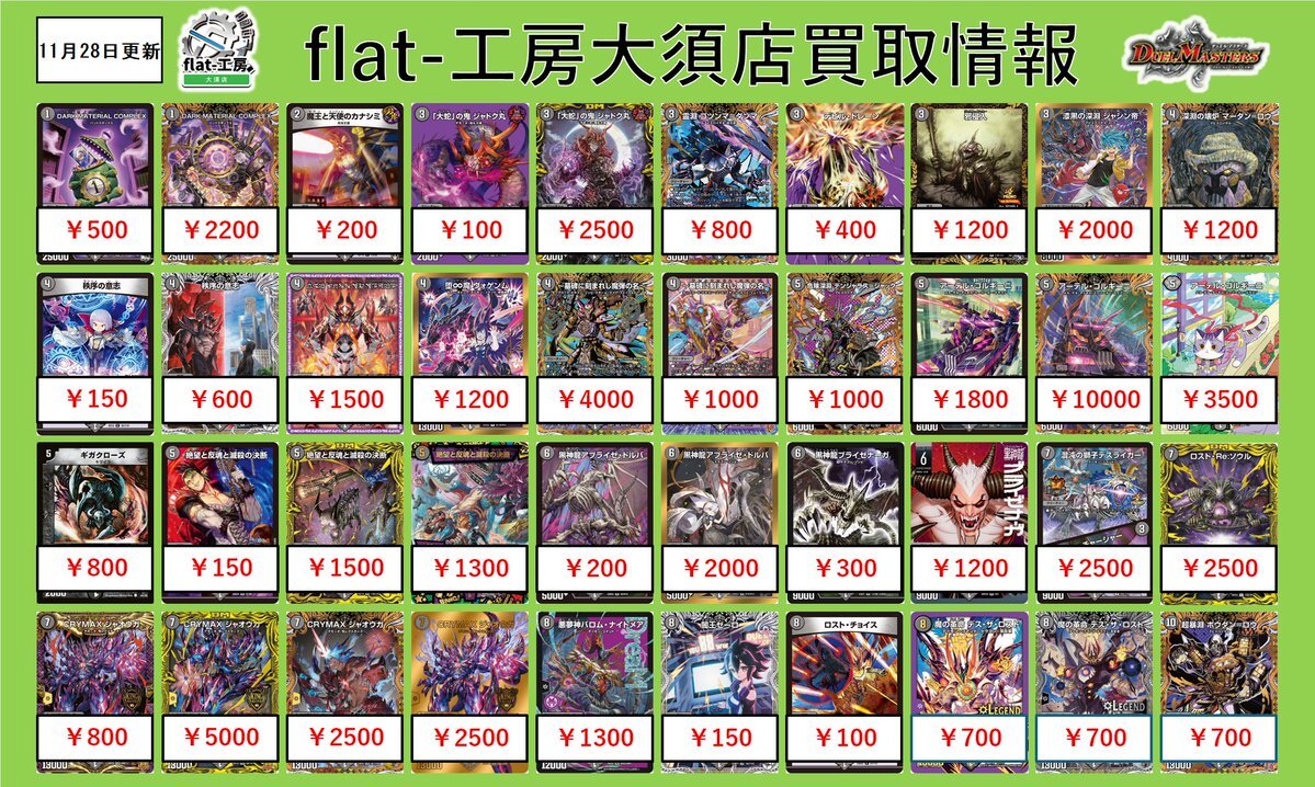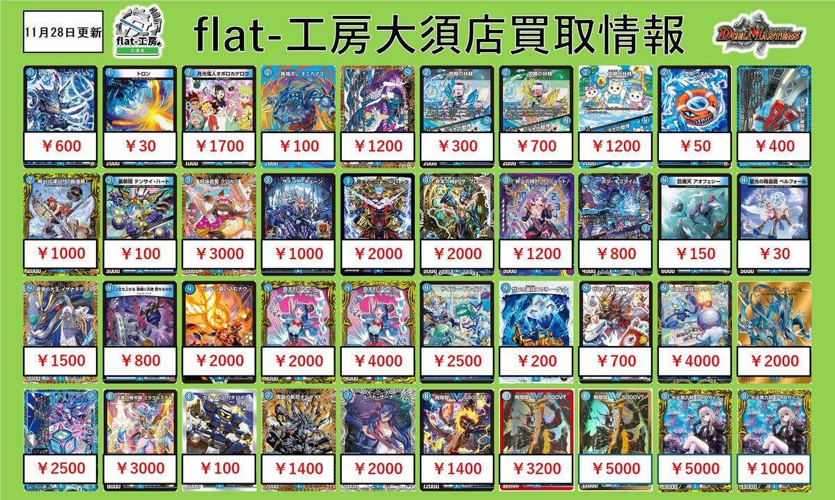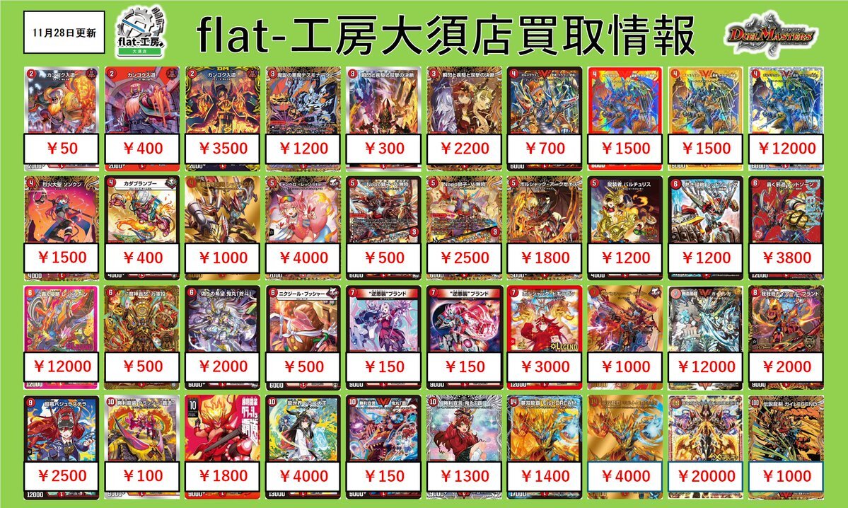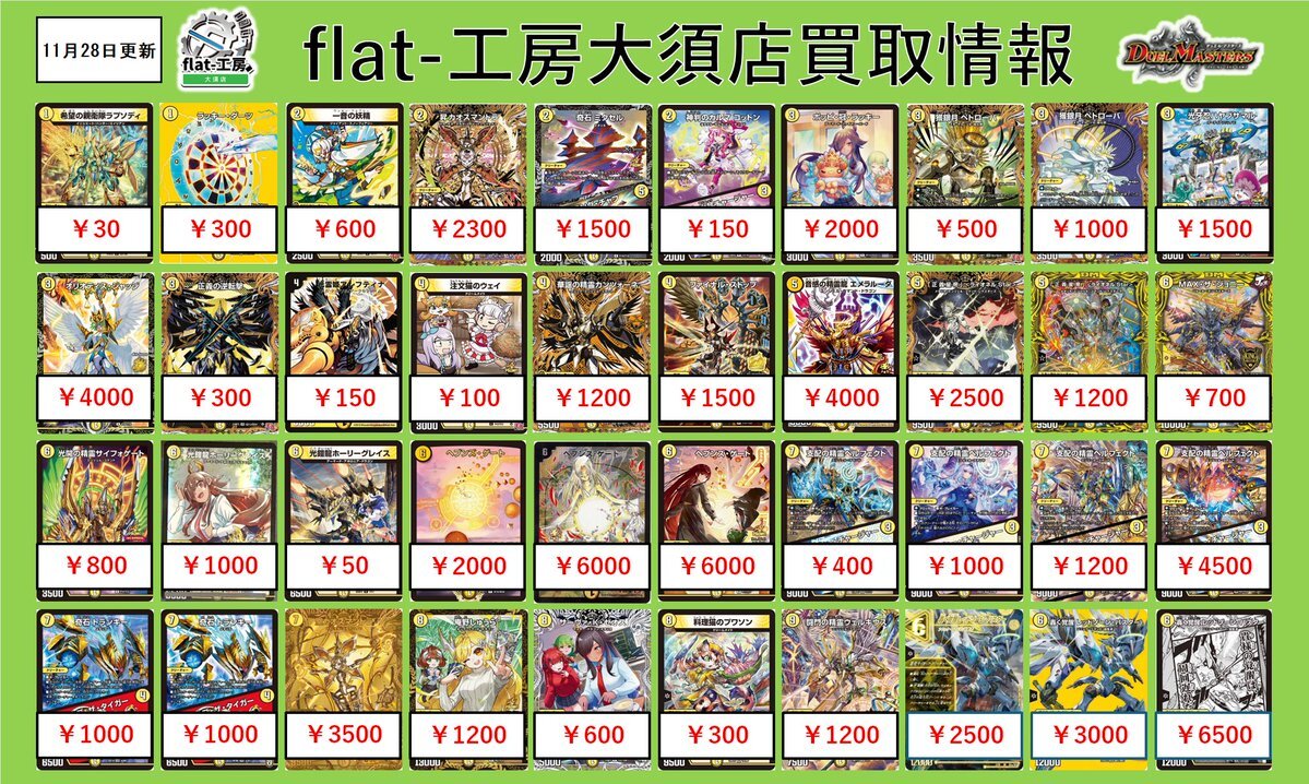 【🦚flat-工房大須店激熱買取情報🦚】 本日も沢山のご来店ありがとうございました💨 こちら明日からの買取表になります‼‼‼‼‼ 沢山のお持ち込みお待ちしております🙇♀️ ※予告なく高価買取を終了する場合がございます。 #高価買取 #デュエマ pic.x.com/kxcj95NDa1