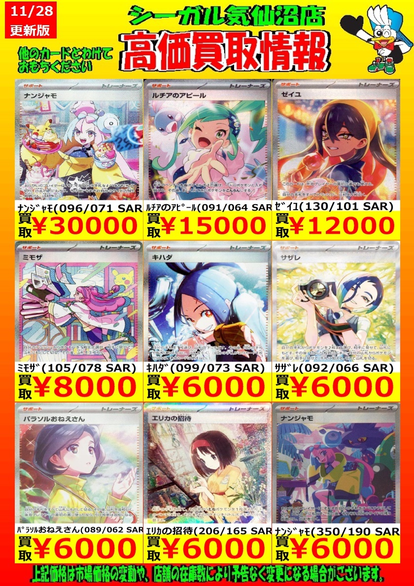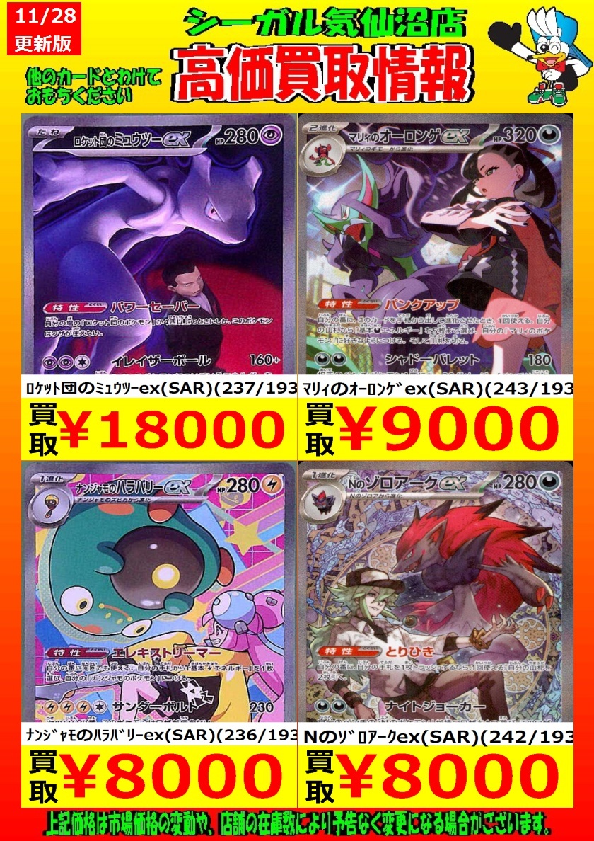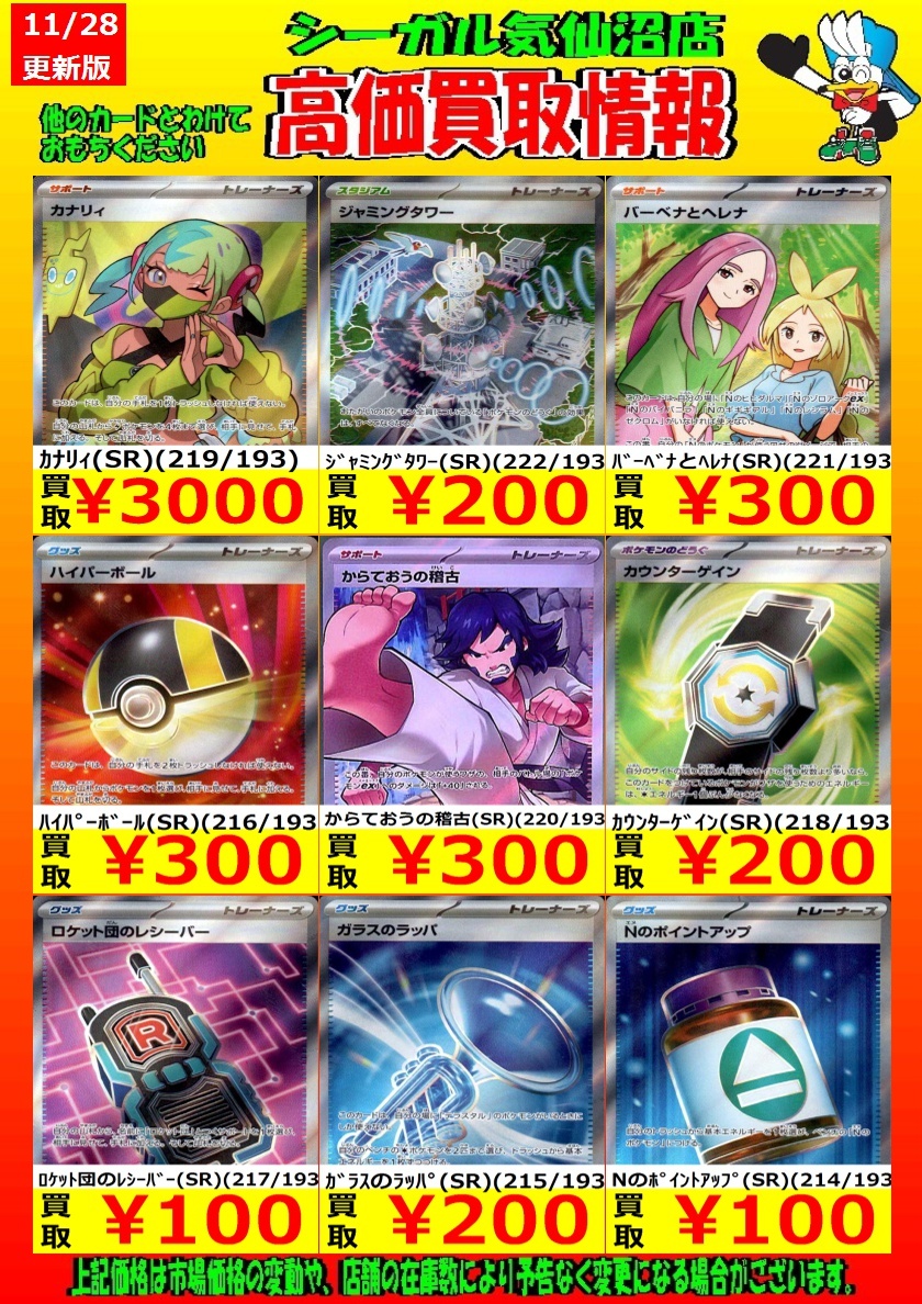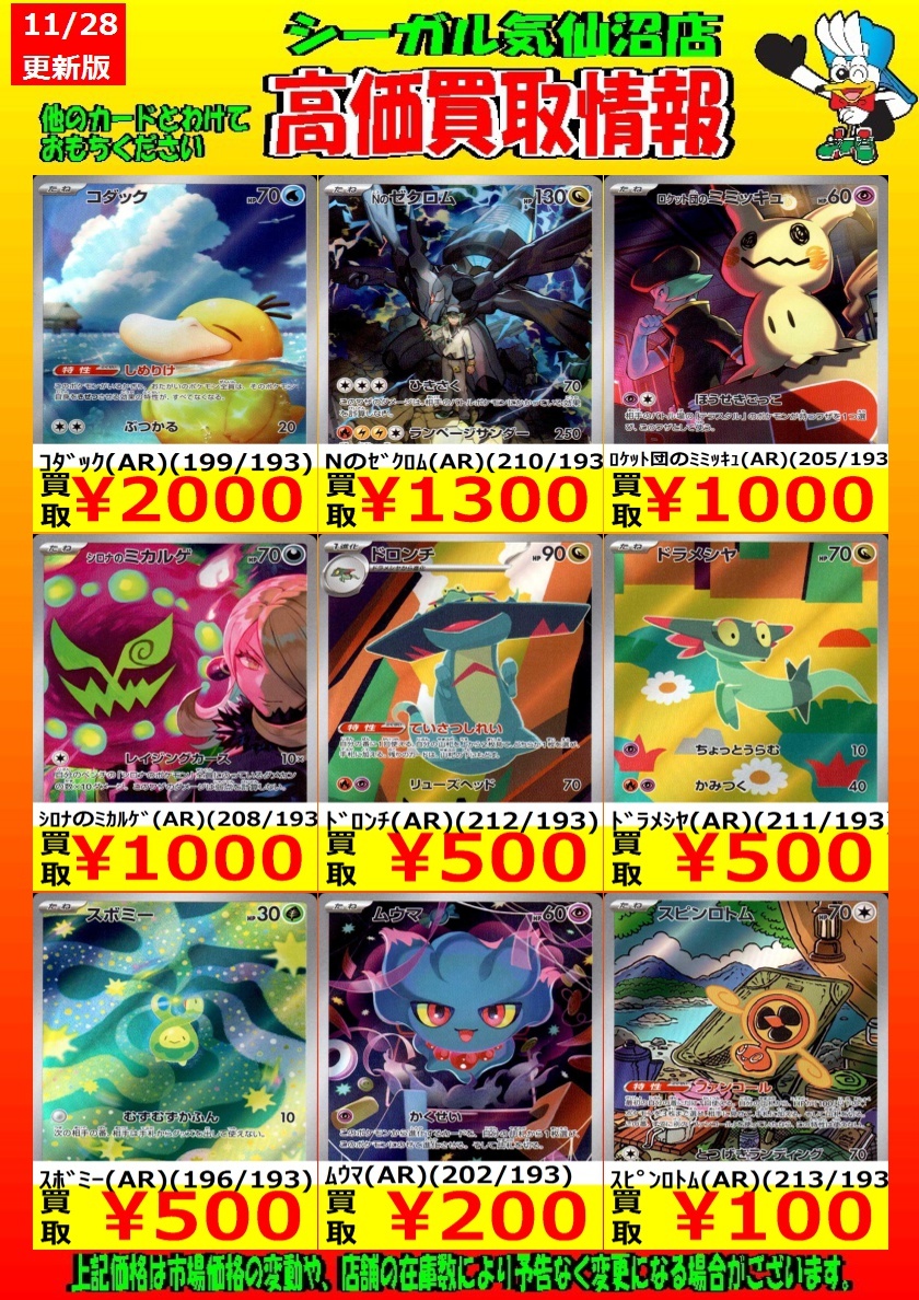 高価買取中! お待ちしております!! カナリィ(SR)(219/193) ¥3,000 Nのゼクロム(AR)(210/193) ¥1,300 ロケット団のミミッキュ(AR)(205/193) ¥1,000 *商品の状態や、在庫状況により 減額の可能性があり、表示価格の 適用外となる場合があります。 #シーガル気仙沼店 #ポケモンカード #高価買取 pic.x.com/X6OFy8zrBU