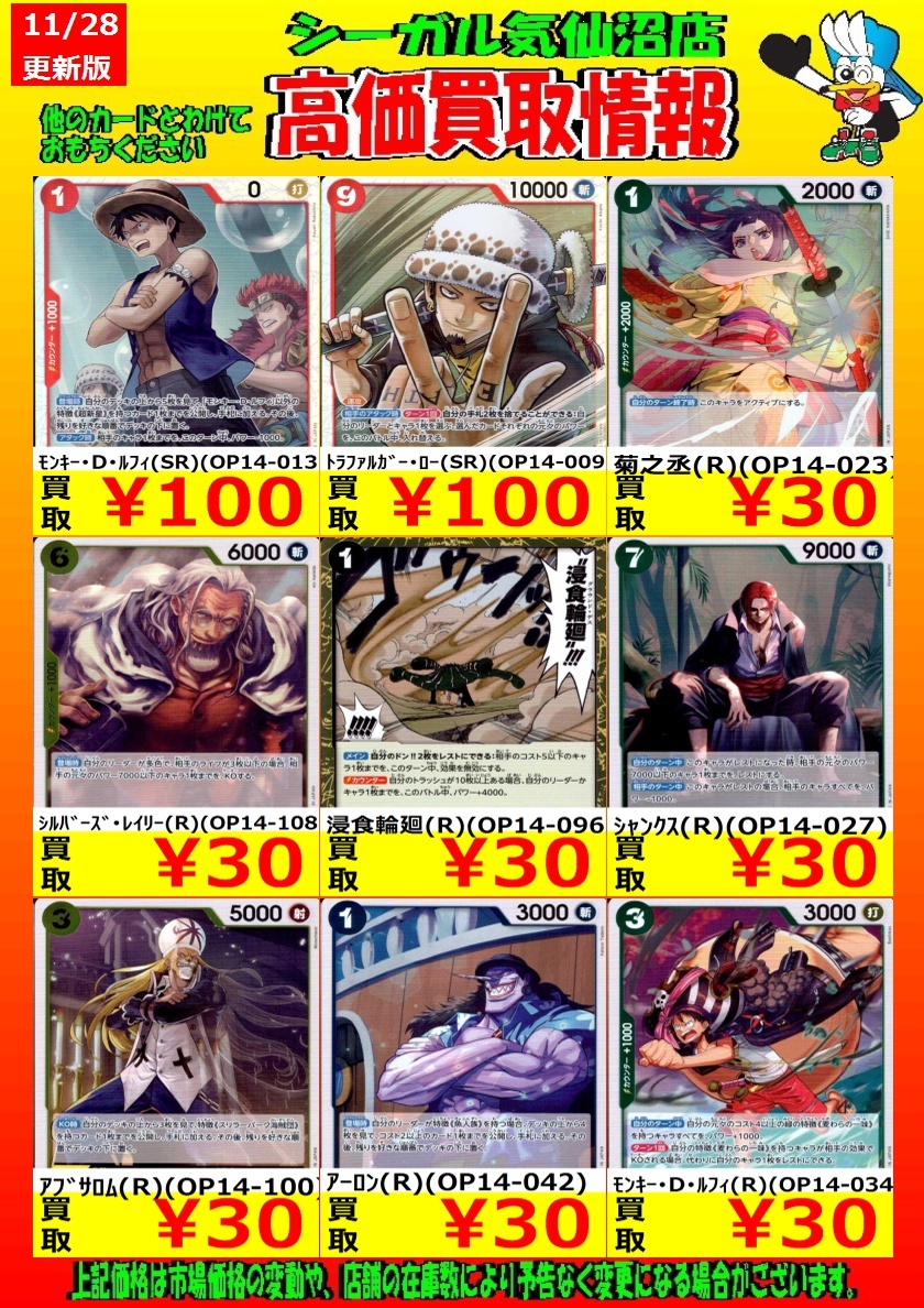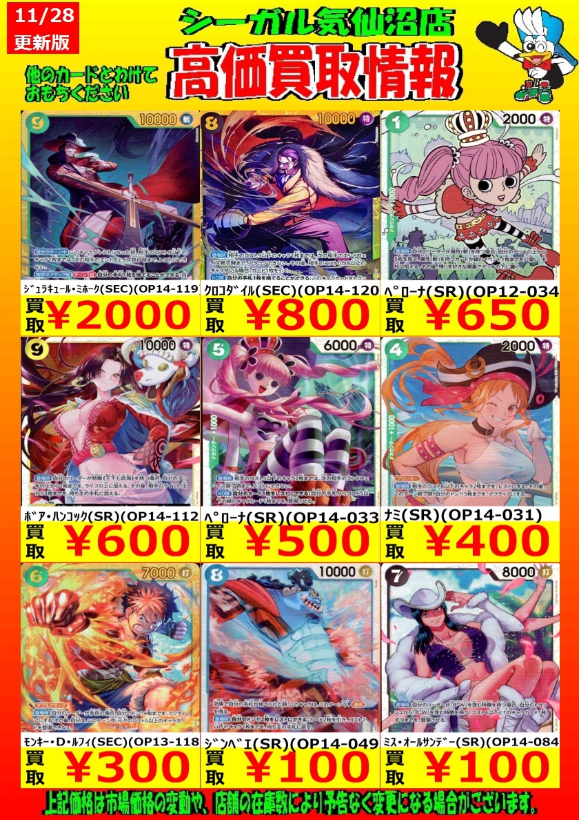 🔴12月1日までの期間限定🔴 高価買取中! お待ちしております!! ジュラキュール・ミホーク(SEC)(OP14-119) ¥2,000 クロコダイル(SEC)(OP14-120) ¥800 *商品の状態や、在庫状況により 減額の可能性があり、表示価格の 適用外となる場合があります。 #シーガル気仙沼店 #ONEPIECE #高価買取 pic.x.com/gJ3UOBPbW8