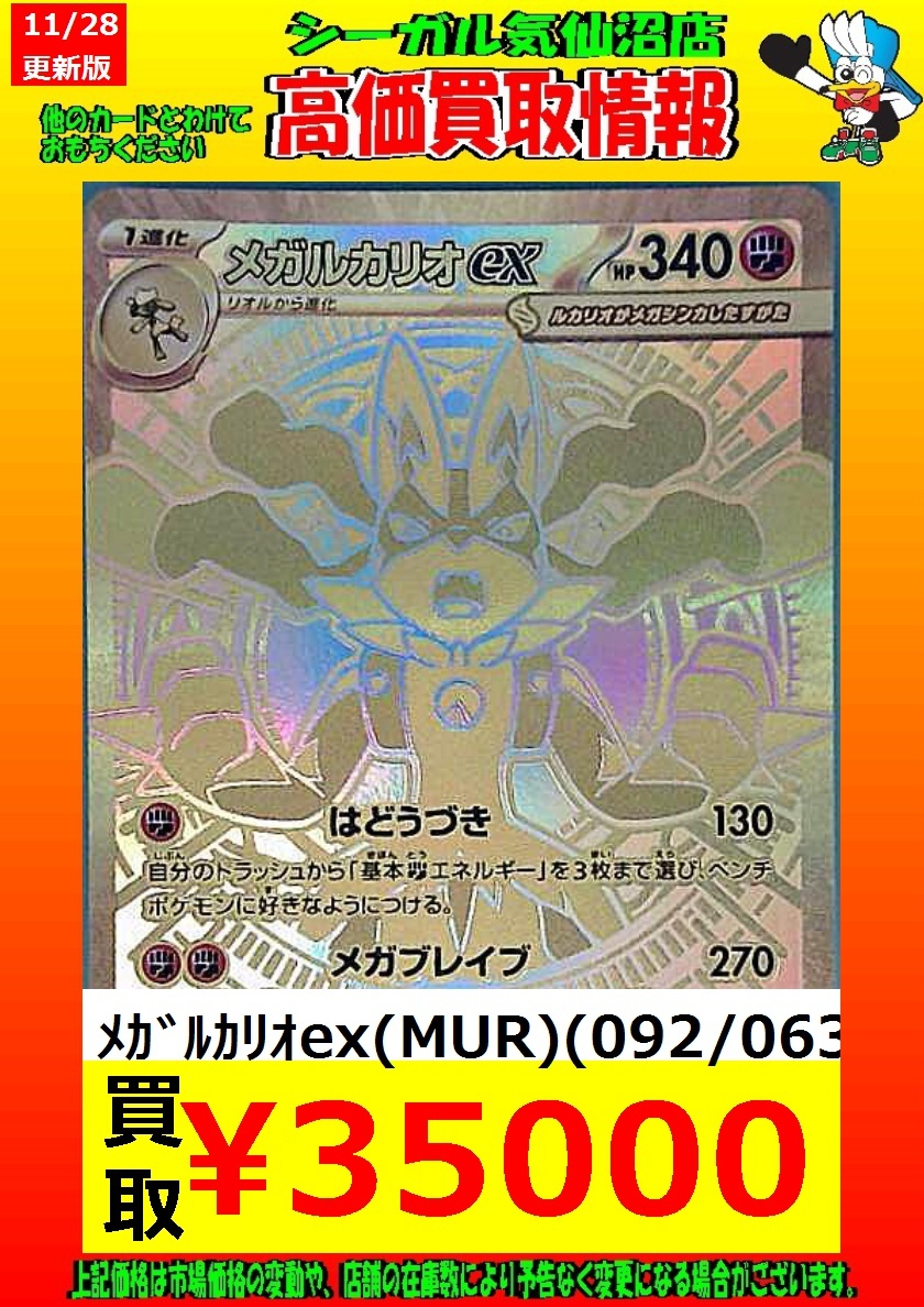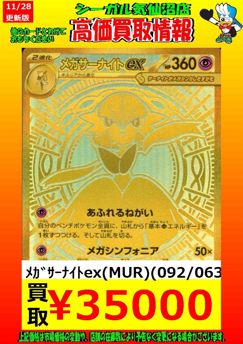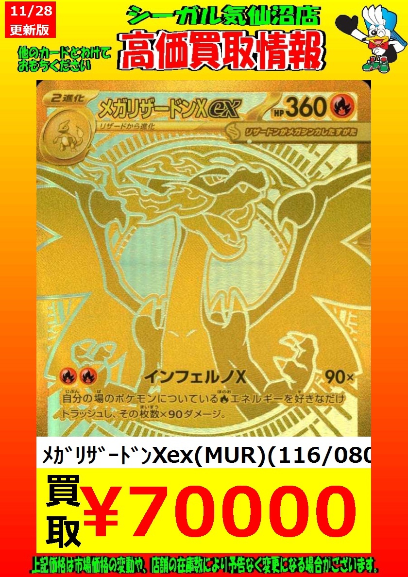 高価買取中! お待ちしております!! メガサーナイトex(MUR)(092/063) ¥35,000 メガリザードンXex(MUR)(116/080) ¥70,000 *商品の状態や、在庫状況により 減額の可能性があり、表示価格の 適用外となる場合があります。 #シーガル気仙沼店 #ポケモンカード #高価買取 pic.x.com/iEsJk3ZoGh