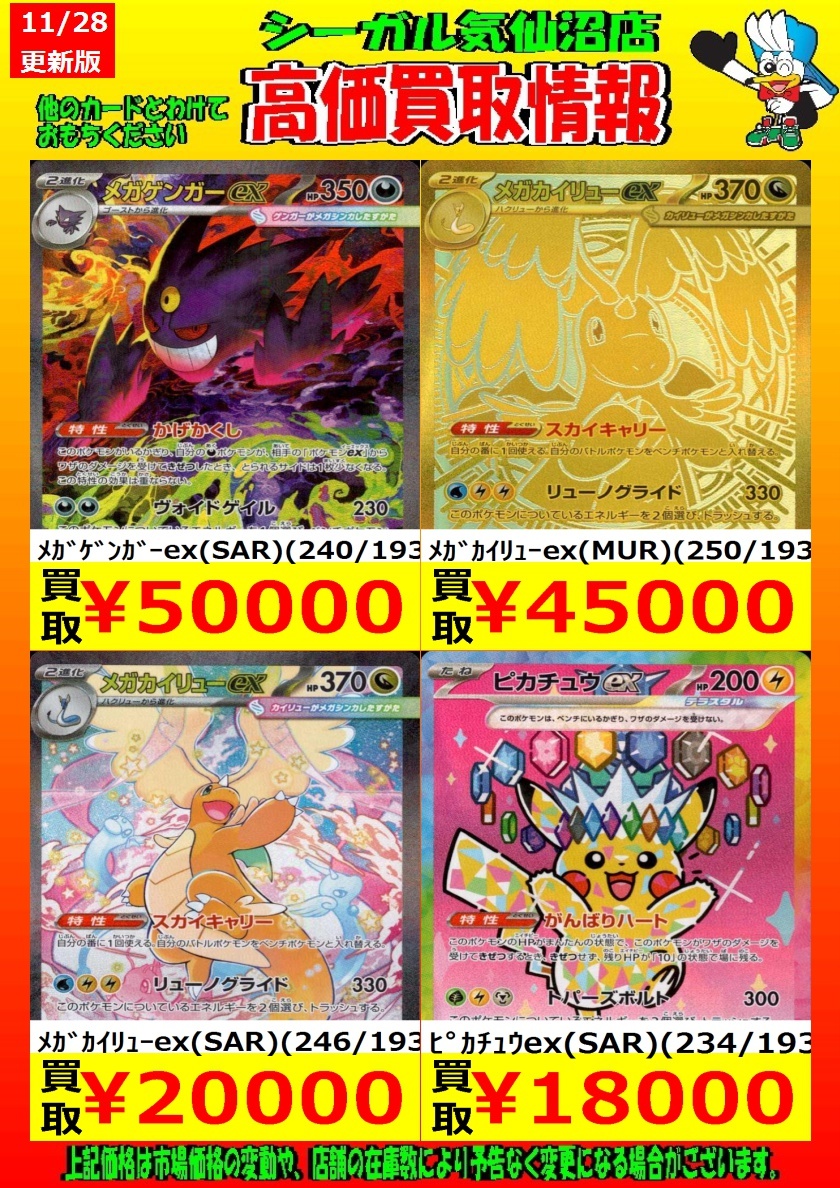 高価買取中! お待ちしております!! メガゲンガーex(SAR)(240/193) ¥50,000 メガカイリューex(SAR)(246/193) ¥20,000 *商品の状態や、在庫状況により 減額の可能性があり、表示価格の 適用外となる場合があります。 #シーガル気仙沼店 #ポケモンカード #高価買取 pic.x.com/Ks9zFpXVAE