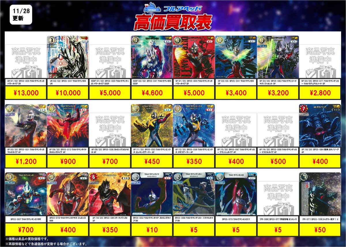 買取表更新情報✨ #ウルトラマンカードゲーム 買取表を更新しました‼ #勇輝の黎明 【BP05】 買取表に掲載中✨ その他買取表は👇 fullahead-buy.com/?shopbrand=ulcg 販売ページは👇 fullahead-digimoncard.com/shopbrand/ulcg #ウルトラマン #高価買取 pic.x.com/nfsieWpZ9e