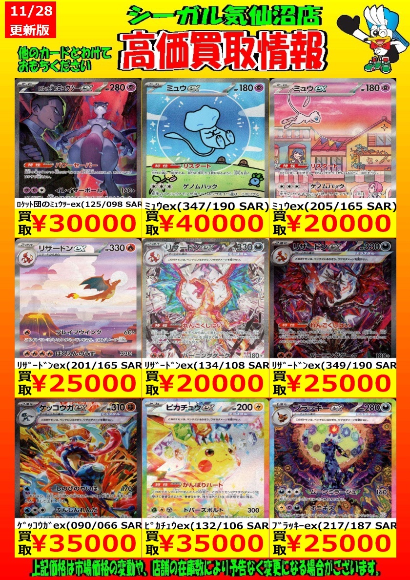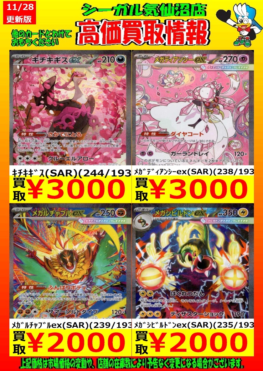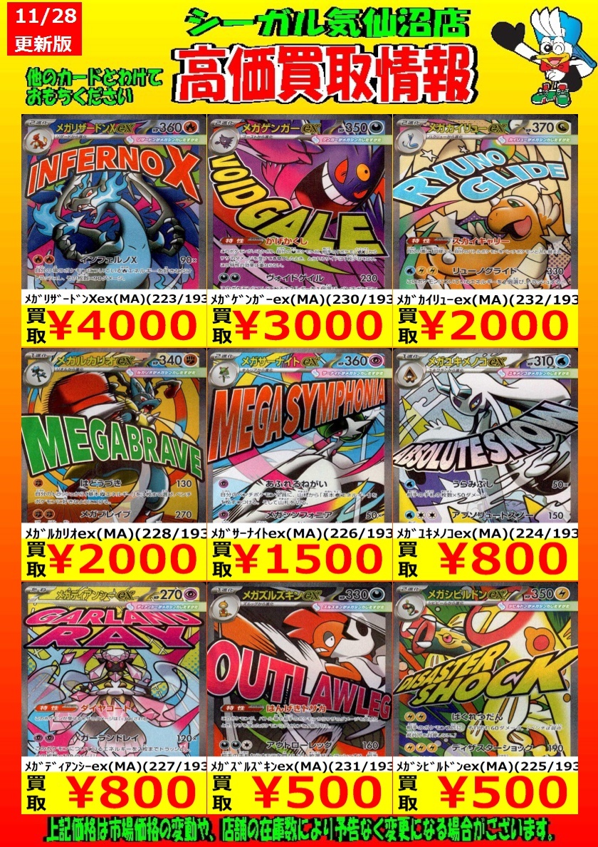 高価買取中! お待ちしております!! メガリザードンXex(MA)(223/193) ¥4,000 メガゲンガーex(MA)(230/193) ¥3,000 *商品の状態や、在庫状況により 減額の可能性があり、表示価格の 適用外となる場合があります。 #シーガル気仙沼店 #ポケモンカード #高価買取 pic.x.com/oBnFHqD31V