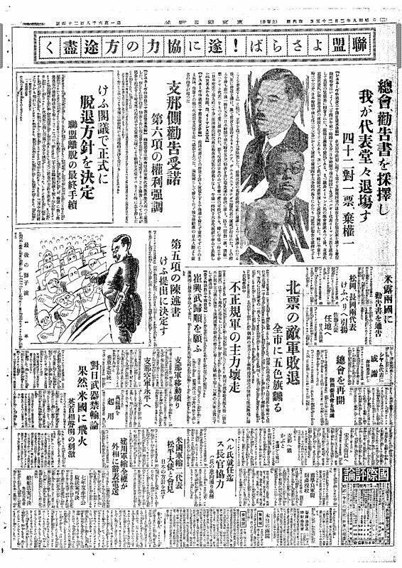 1933年2月24日、国際連盟総会で日本の満州での軍事行動が否定され、それを不当とした全権大使・松岡洋右は連盟脱退を宣言し退場しました。 採決は42対1で否決されましたが、日本世論は、 「向こうは死に(42)体でこっちは1番なんだ」 という風に、連盟脱退へ肯定的な風潮にありました。