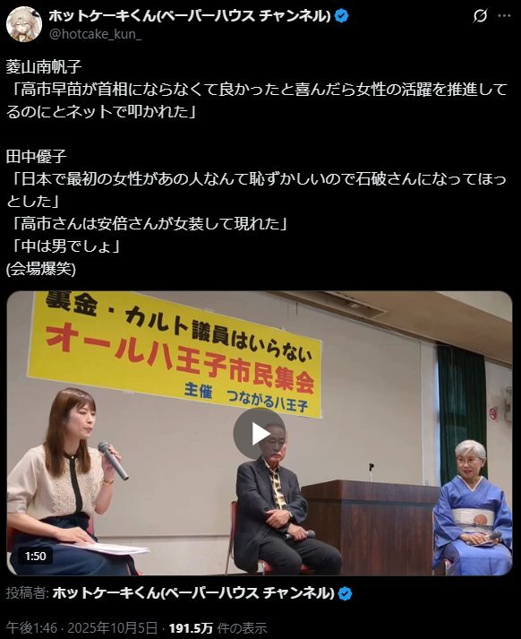 「高市さんは安倍さんが女装して現れた」 「中は男でしょ」 まさに的を射ていますよね😂 #高市やばい #高市いらん #高市やめろ #高市早苗は統一教会 #高市早苗だけは絶対ダメ #高市早苗は日本の韓鶴子 #高市やばい #高市いらん #高市やめろ #高市早苗は麻生太郎の操り人形 #高市早苗は総理の器に非ず x.com/abdul333666999…
