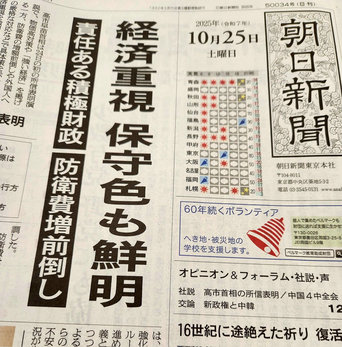 きょうの「朝日」の見出し ダメだなあ。なぜ「極右」と書けないのか!?見出しだけ見ると、まるで高市政権応援紙かと見まがう。 #高市早苗首相所信表明演説 pic.x.com/NBv1Nm0yae