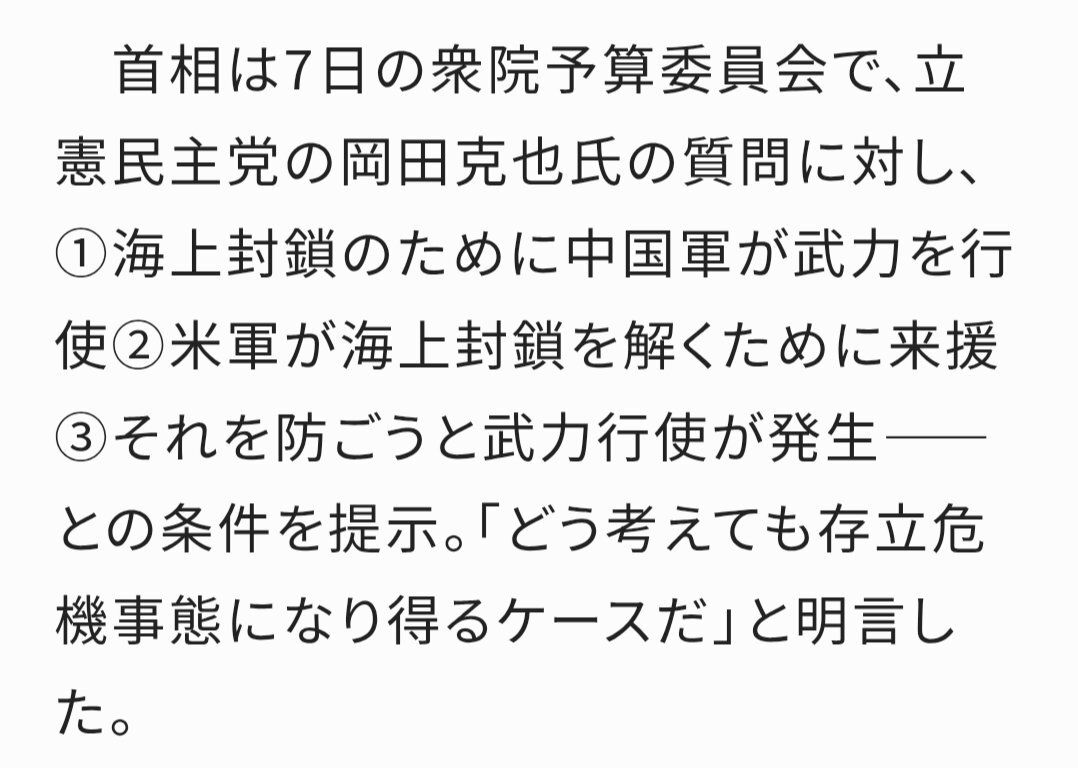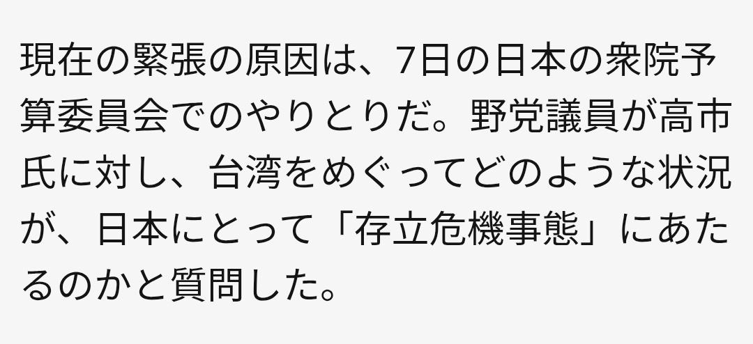 これ大問題だぞ。 高市氏の台湾有事は存立危機事態になりうる発言で中国との緊張が急激に高まってる。 戦争に巻き込まれるリスクだけじゃなく、輸出入でも中国への依存が強い日本がさらなる輸入物価高で苦しむことになりかねない。 平和外交をぶっ壊した最悪の首相だ。撤回の上、辞任すべき x.com/hst_tvasahi/st…
