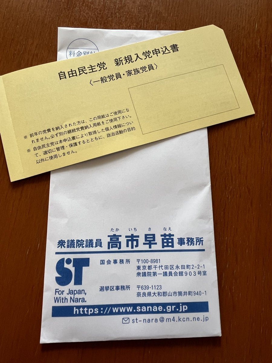 待ち侘びた入党申込書 高市早苗事務所より夫婦で入党します。 #高市早苗さんを支持します #高市総理大臣を支持します #高市首相を支持します #高市政権を長期政権に pic.x.com/QlqxHQGcxz
