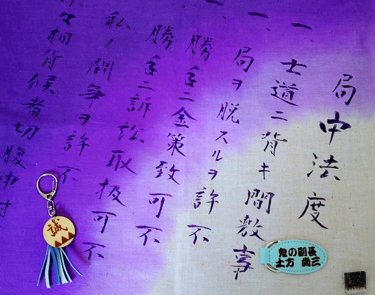 年内最後の日野新選組マルシェ。前回購入諦めた局中法度の染め布(遠州木綿の染め布で合っていますか?)とキーホルダー、だんだらブローチピン購入しました。染め布の色は紫紺?かな?、気に入りました👍 #新選組 #日野新選組マルシェ #型染め #高幡不動 pic.x.com/9KSvfU913p