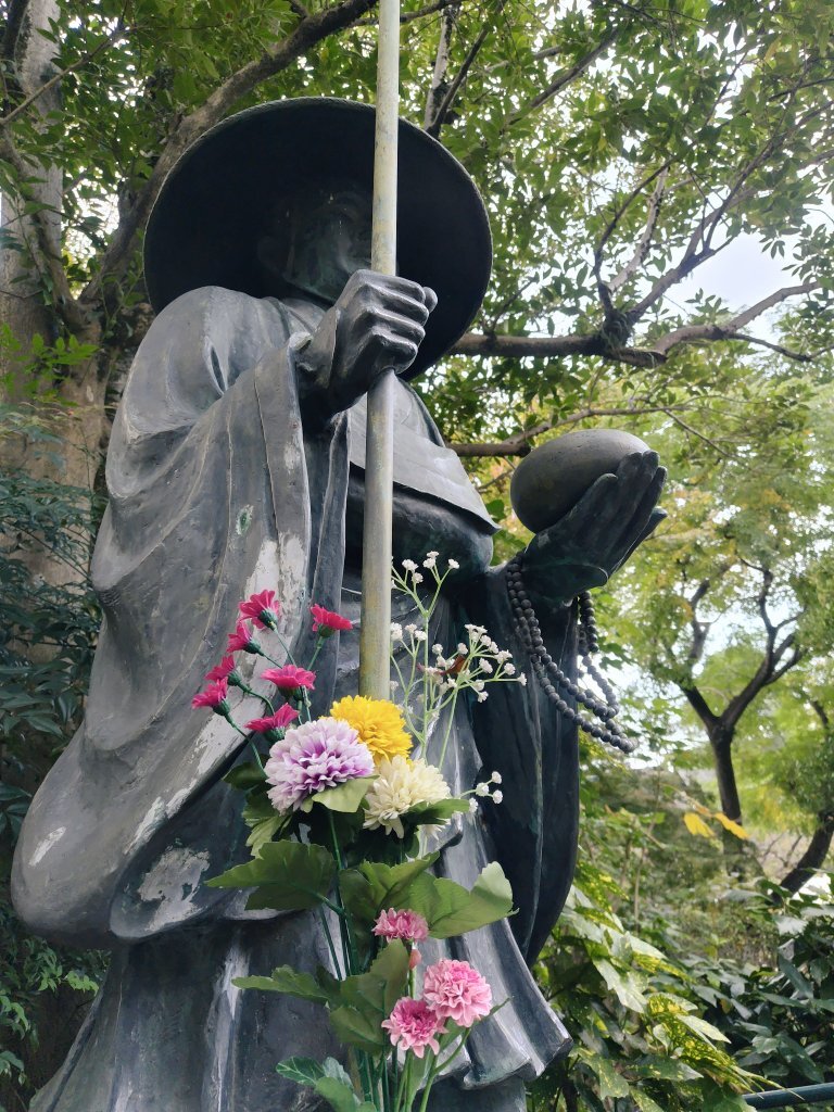 大師堂の前の紅葉が美しく色付いており、ここで写真を撮る人が多く、中国語も飛び交っていた。 弘法大師さんは密教を学ぶために遣唐使として中国に留学しているので、ここで中国語を聞いてどんな気持ちだろうか……と思った。 #高幡不動 菊まつり pic.x.com/WKWNAFy4Bq