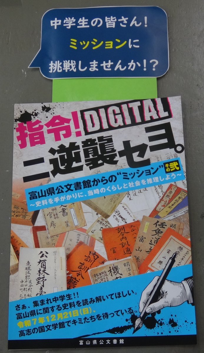 令和7年12月21日(日)に“#富山県公文書館 からのミッション”「指令! DIGITAL ニ逆襲セヨ。」を #高志の国文学館 にて開催予定です。中学生を対象として富山の #歴史 に関する史料を読み解くイベントです。お申込みは令和7年12月14日(日)まで、先着順にて受付けております。 pic.x.com/gRduOiRckG