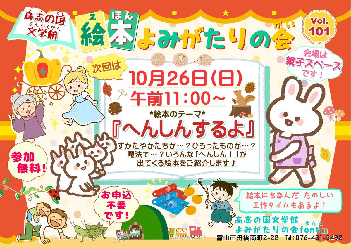 毎月第4日曜日 午前11時から 館内の「親子スペース」にて定期開催している未就学児向けの『絵本よみがたりの会』📚 次回10月26日(日)のテーマは『へんしんするよ』 いろんな「変身!」の絵本をご紹介!体を動かす遊びや工作タイムも🎵ぜひ遊びに来てくださいね✨ #高志の国文学館 #絵本よみがたりの会 pic.x.com/guwwUIL8Nm