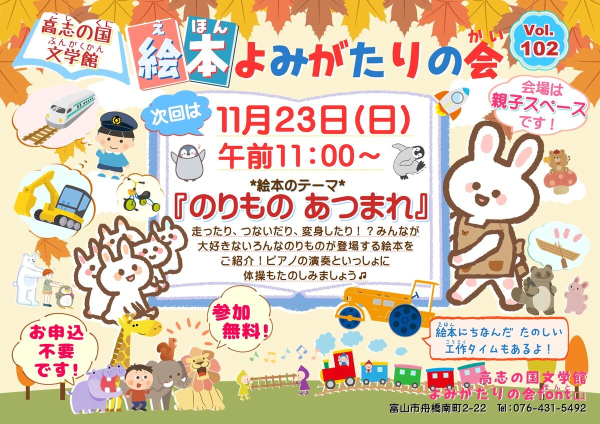 毎月第4日曜日 午前11時から 館内の「親子スペース」にて定期開催している未就学児向けの『絵本よみがたりの会』📚 次回11月23日(日)のテーマは『のりもの あつまれ』 いろんなのりものの絵本をご紹介!たのしい体操や工作タイムも♪ぜひ遊びに来てくださいね✨ #高志の国文学館 #絵本よみがたりの会 pic.x.com/An6lx0cwhb