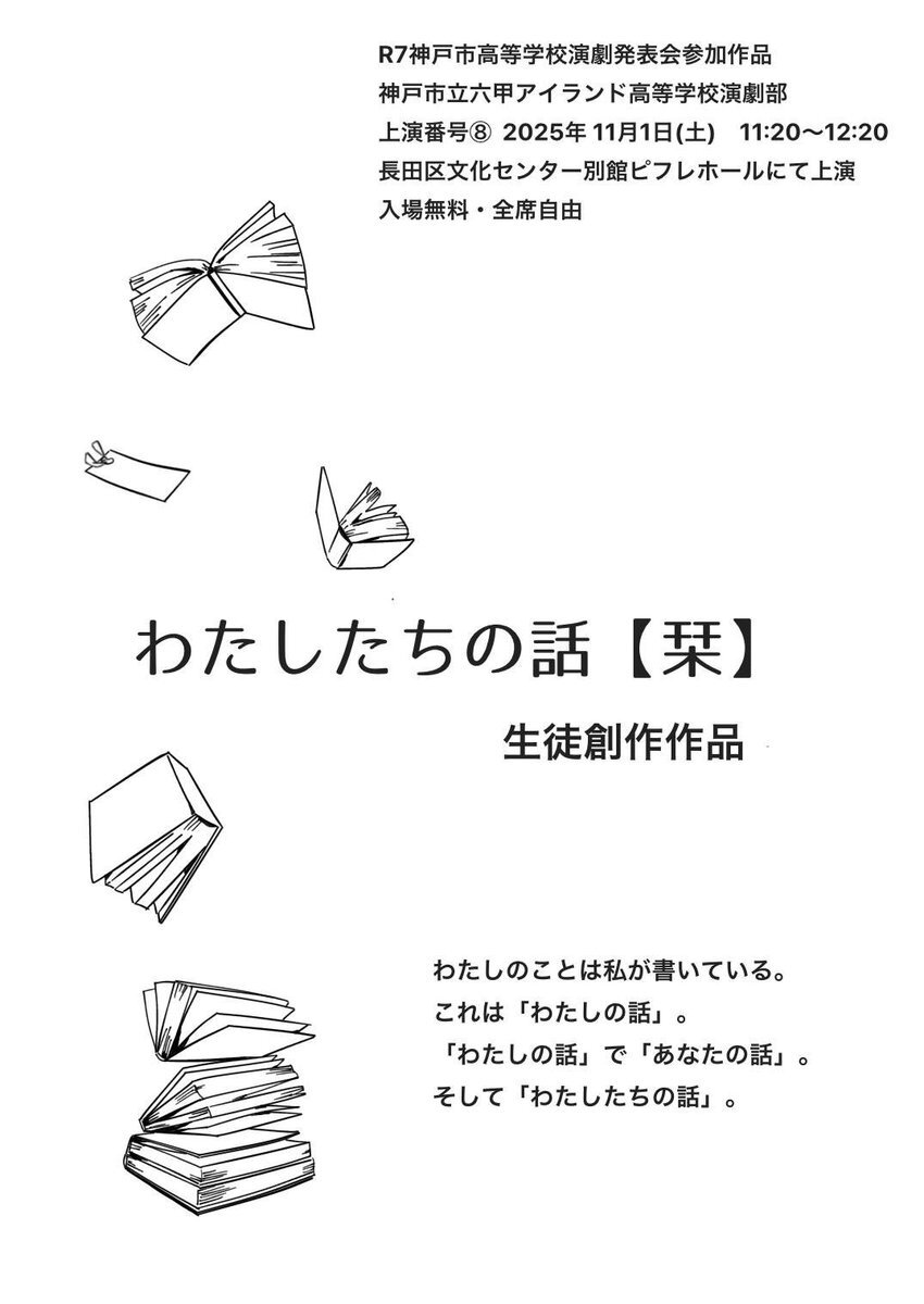 コンクール情報!!!!!!! 今年のコンクールは生徒創作の脚本です! あらすじはALTにて。 日時・場所 11月1日土曜日 11時20分〜12時20分 ピフレホール 「わたしたちの話【️栞】」、皆様のご来場を心よりお待ちしております。 #六アイ演劇部 #高校演劇 pic.x.com/KhDNyJzhwC