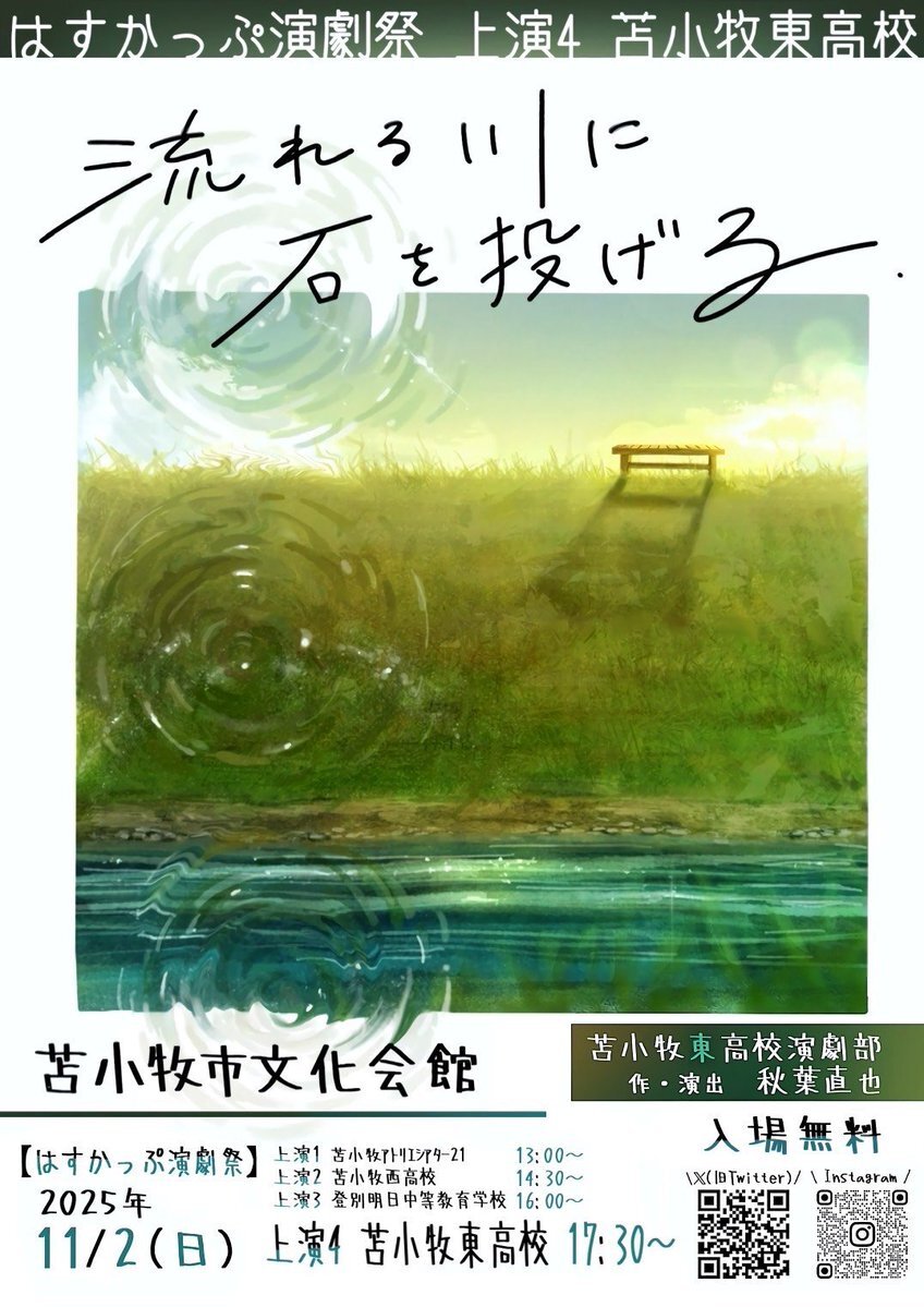 🔔上演情報🔔 〜はすかっぷ演劇祭〜 流れる川に石を投げる 11月2日 17:30〜 苫小牧市文化会館 来年3月を持ちまして 苫小牧市文化会館が閉館されます。 ラスト公演でもありますので お見逃しなく!🕺 皆さまのご来場を心より お待ちしています🥹💖 #苫小牧東高校 #苫東演劇部 #高校演劇 pic.x.com/qFWd9PDFfQ
