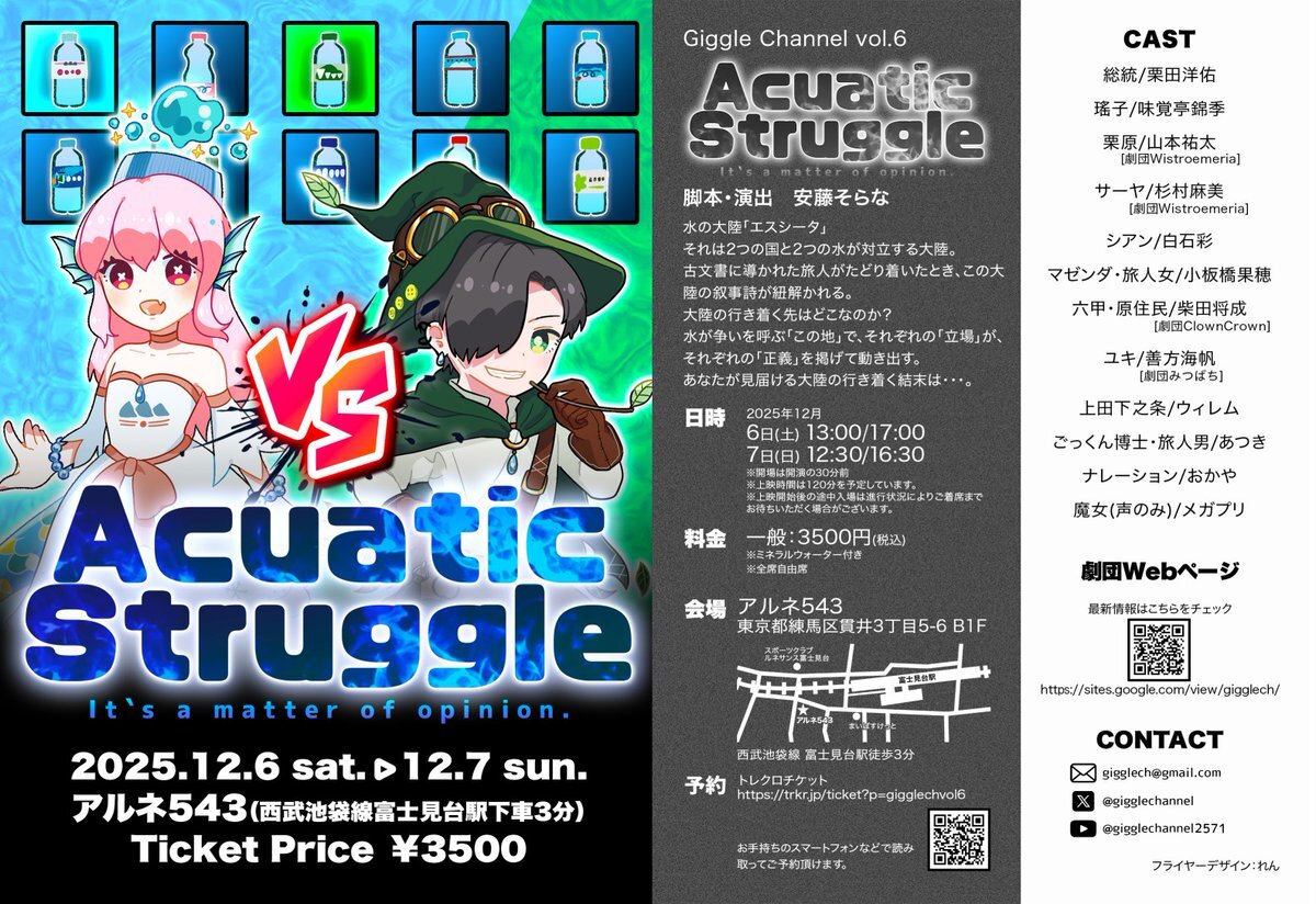12月の公演内容詳細をようやくお届けできます。 多くの方にご覧いただけたら幸いです。 ■タイトル: GiggleChannel Vol.6『Aquatic Struggle』 ■あらすじ: 水の大陸「エスシータ」 それは2つの国と2つの水が対立する大陸。