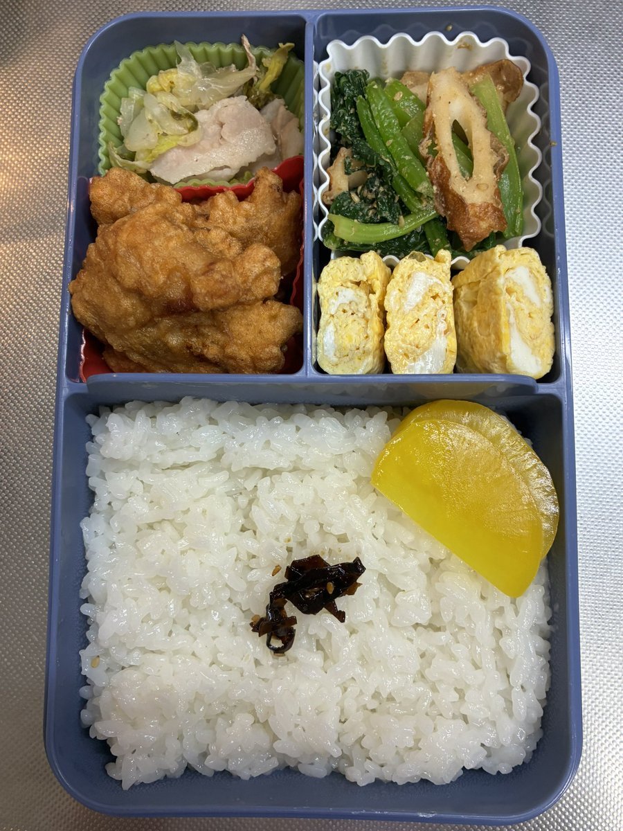 2025.10.28(火) 259個目 唐揚げ 白菜と豚肉の重ね蒸し 小松菜とちくわのゴマあえ 卵焼き #お弁当記録 #高校生男子お弁当 #母も頑張った pic.x.com/JBPW3M7pTr