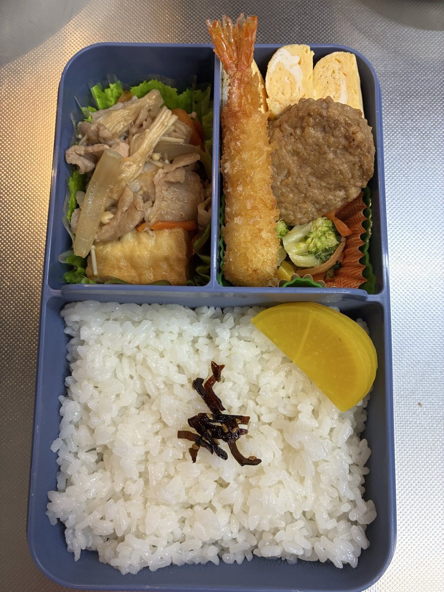 2025.10.30(水) 261個目 豚バラと厚揚げの生姜焼き 卵焼き ハンバーグ エビフライ ブロッコリーのバターソテー #お弁当記録 #高校生男子お弁当 #母はエビフライが嫌いだ pic.x.com/ANRJ5ES70d