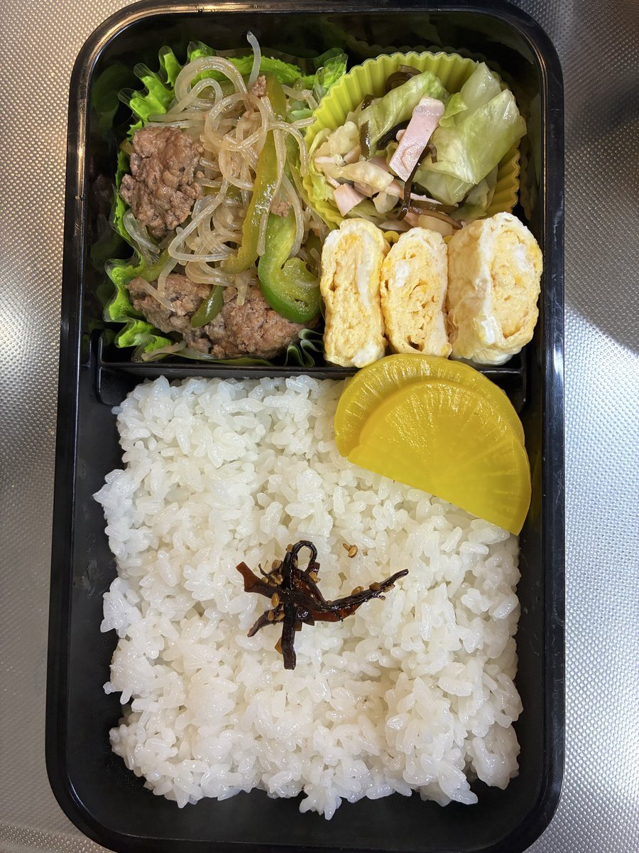 2025.10.29(水) 260個目 ピーマンとミンチの春雨炒め キャベツとハムの塩昆布あえ 卵焼き #お弁当記録 #高校生男子お弁当 #母も頑張った pic.x.com/wcaxkIHJ0M