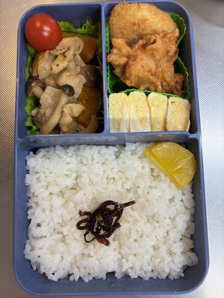 2025.11.6(木) 263個目 豚バラとかぼちゃとしめじのオイスターソース炒め 唐揚げ サーモンメンチフライ 卵焼き #お弁当記録 #高校生男子お弁当 #母も頑張った pic.x.com/Rm7gvRqUln
