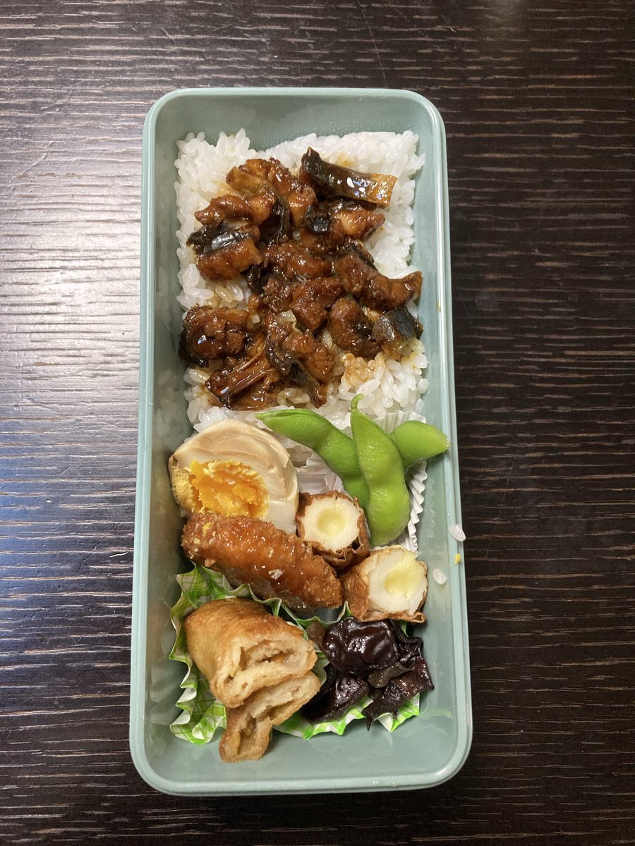 520 月曜日 風邪気味のため遅刻登校予定、、 鰻めし 春巻き 冷凍とんかつ キクラゲ炒め 味玉 枝豆 竹輪チーズ  #お弁当記録 #高校生男子弁当 pic.x.com/ShYgB4YtJS