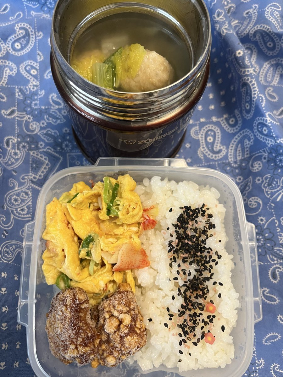 今日のお弁当 肉団子スープ カニカマの卵炒め 冷食たれづけ竜田揚げ スープは鍋キューブ鶏うま塩に米久の肉団子と野菜を入れただけ #お弁当記録 #スープジャー #高校生男子弁当 pic.x.com/3Lpm3U5uoE
