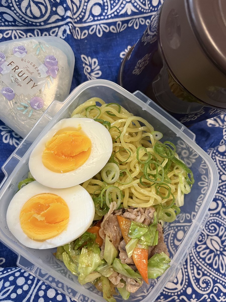今日のお弁当 醤油ラーメン ゆで卵 肉野菜炒め おにぎり 定期テスト前なのに発熱してる人がいて困った…中学生が定期テスト受けなかったら成績どうなるんだ❓ #お弁当記録 #高校生男子弁当 pic.x.com/Q7bfklROBO
