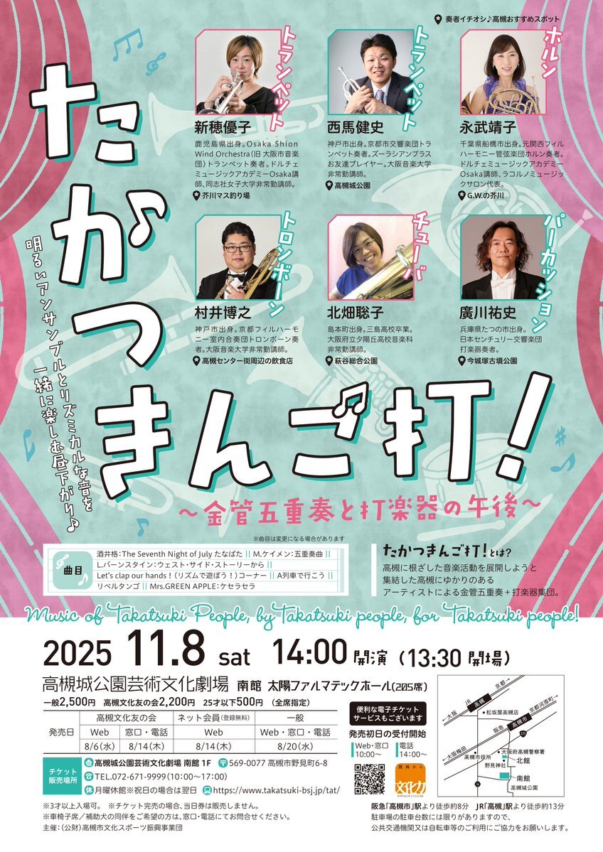 📣【演奏会のご案内】 【11/8(土) 高槻】 #金管五重奏+#打楽器《#たかつきんご打!》🎶 プロ奏者による華やかな午後の #音楽会✨ 11/8(土)「たかつきんご打!」 #高槻城公園芸術文化劇場 にて。 takatsuki-bsj.jp/tat/event/2025… . 出演:#日本センチュリー交響楽団打楽器奏者 #廣川祐史 さんほか✨ pic.x.com/Vh1PtNNF7y