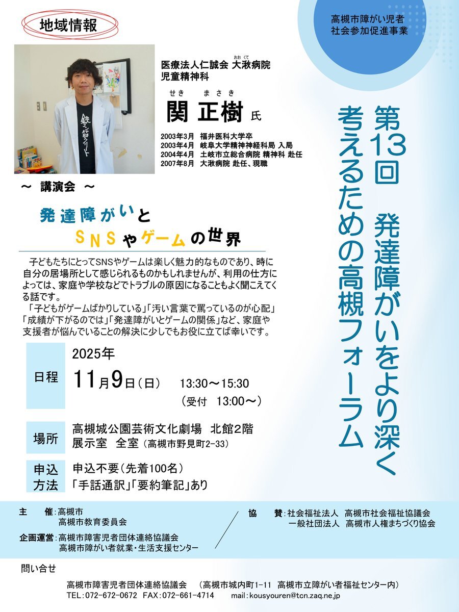 11月9日(日)13:30 高槻城公園芸術文化劇場 北館2階 第13回 発達障がいをより深く考えるための高槻フォーラム #発達障がい #障がい #関正樹 #大湫病院 #SNS #ゲーム #高槻フォーラム #高槻城公園芸術文化劇場 pic.x.com/wXo2rSjqv7