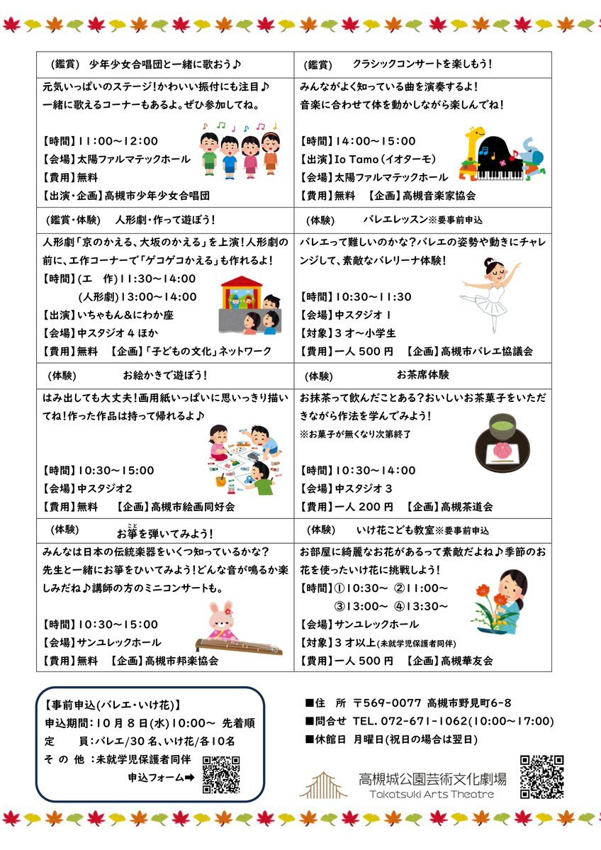 【受付情報】 11/15(土)南館で『こども文化祭』を開催します。市内文化団体によるミニコンサート、お箏や茶道などの体験コーナーを実施。いけ花、バレエ体験は事前予約受付中です。予約不要・参加無料のブースもございます! 詳細▶takatsuki-bsj.jp/tat/event/2025… #高槻城公園芸術文化劇場 #ファミリー向け pic.x.com/72l4qB7D9v
