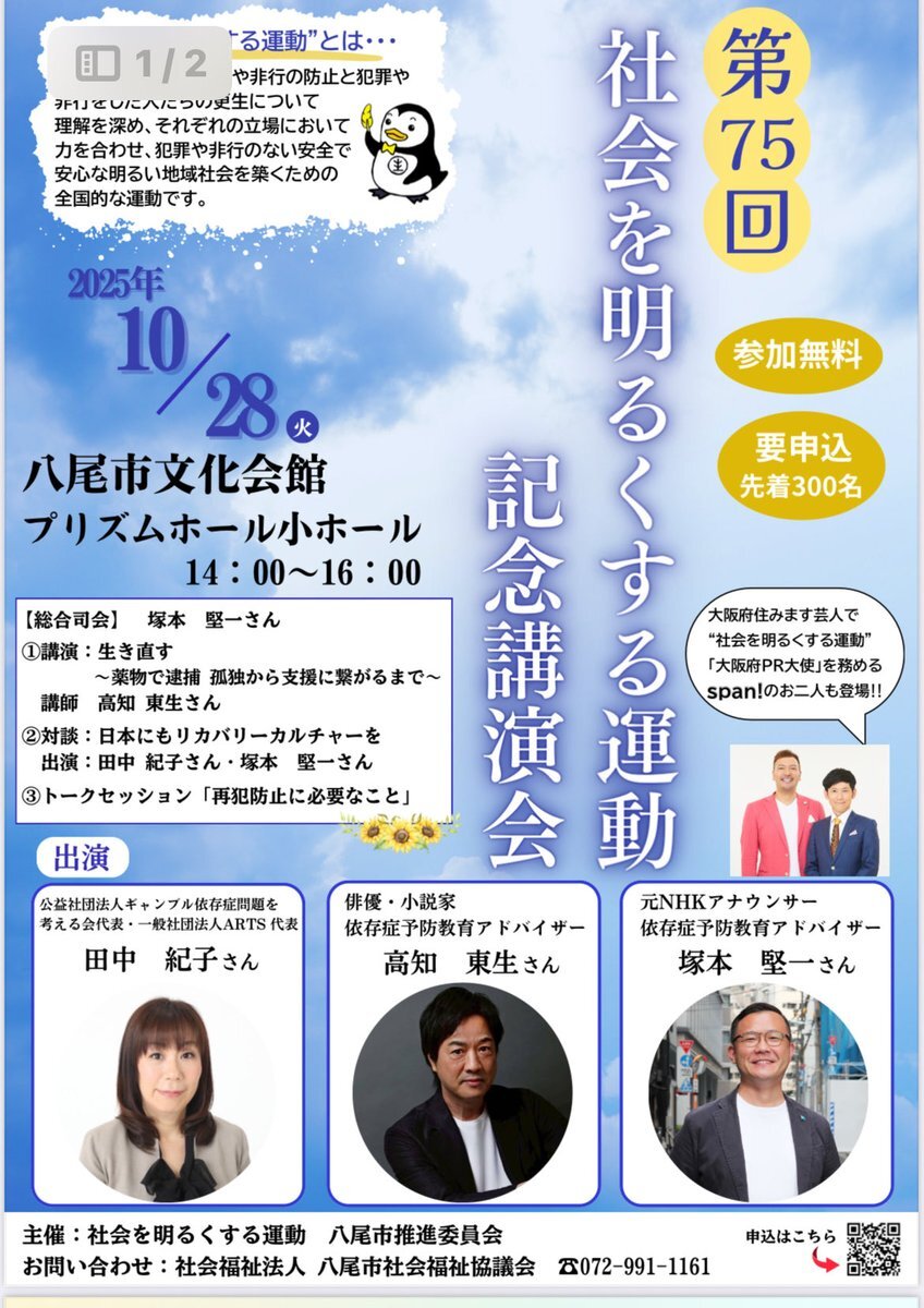 明後日10月28日(火)八尾市文化ホールにて開催です。 社会を明るくする運動記念講演会にぜひおいでください。 #社会を明るくする運動 #リカバリーカルチャー #八尾市文化会館 #高知東生 #塚本堅一 pic.x.com/WljdzggRZL