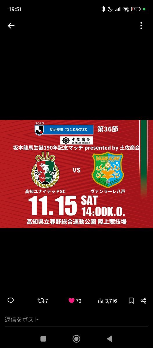 【11/15(土) 八戸戦】 ホームゲーム 試合情報を掲載しました。 🏆2025明治安田J3リーグ 第36節 坂本龍馬生誕190年記念マッチ Presented by #土佐商会 🗓11/15(土) 14:00K.O. 🆚#ヴァンラーレ八戸 🏟春野陸 🔽試合情報はこちらℹ️ kochi-usc.jp/news/news-5391… #高知ユナイテッドSC #高知一心