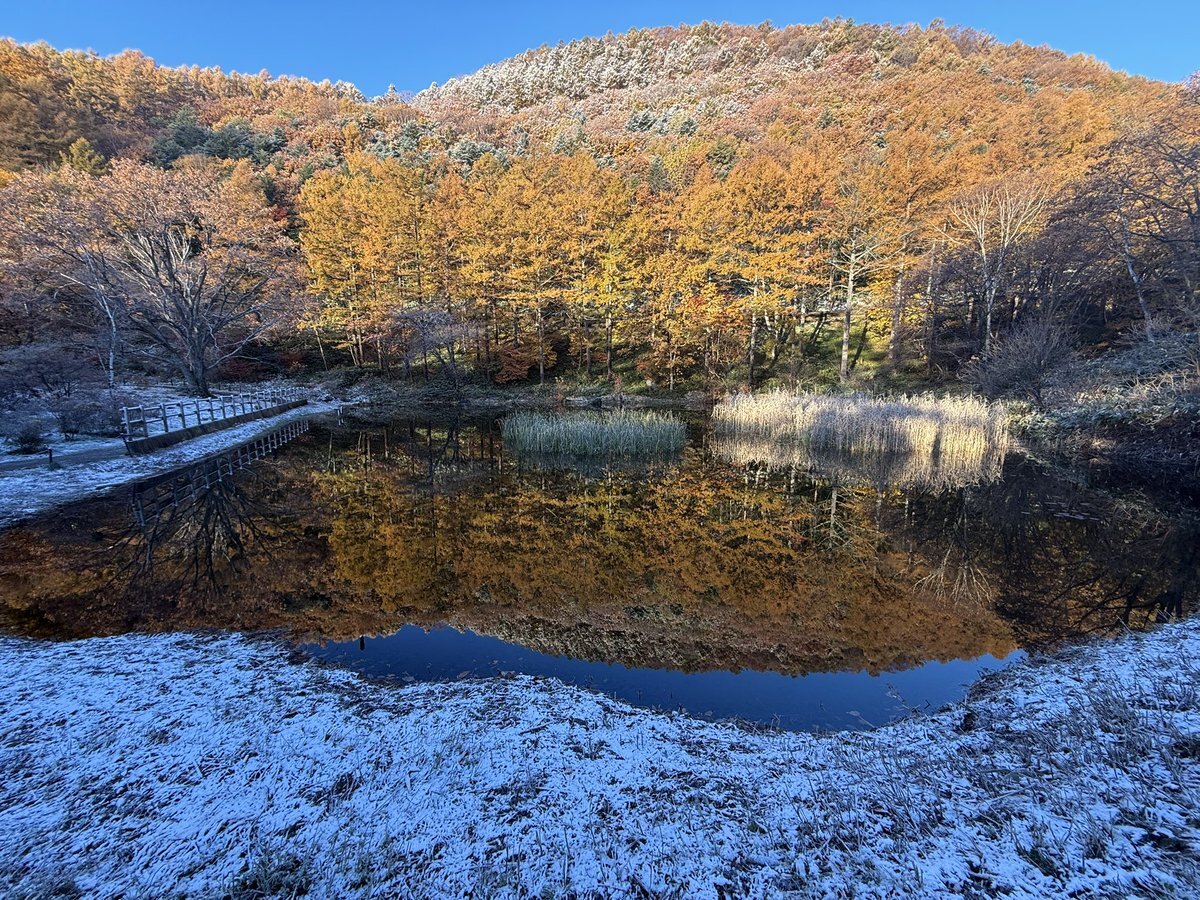 昨日は寒かったですね。 草津温泉では初雪が降りました❄️ 一夜過ぎた草津温泉はよく晴れ、空気が澄んでとても冷え込んでおります。 先日テレビ放送があった鬼の相撲場の池も雪化粧 この時期しか見れない紅葉と雪のコントラストです。