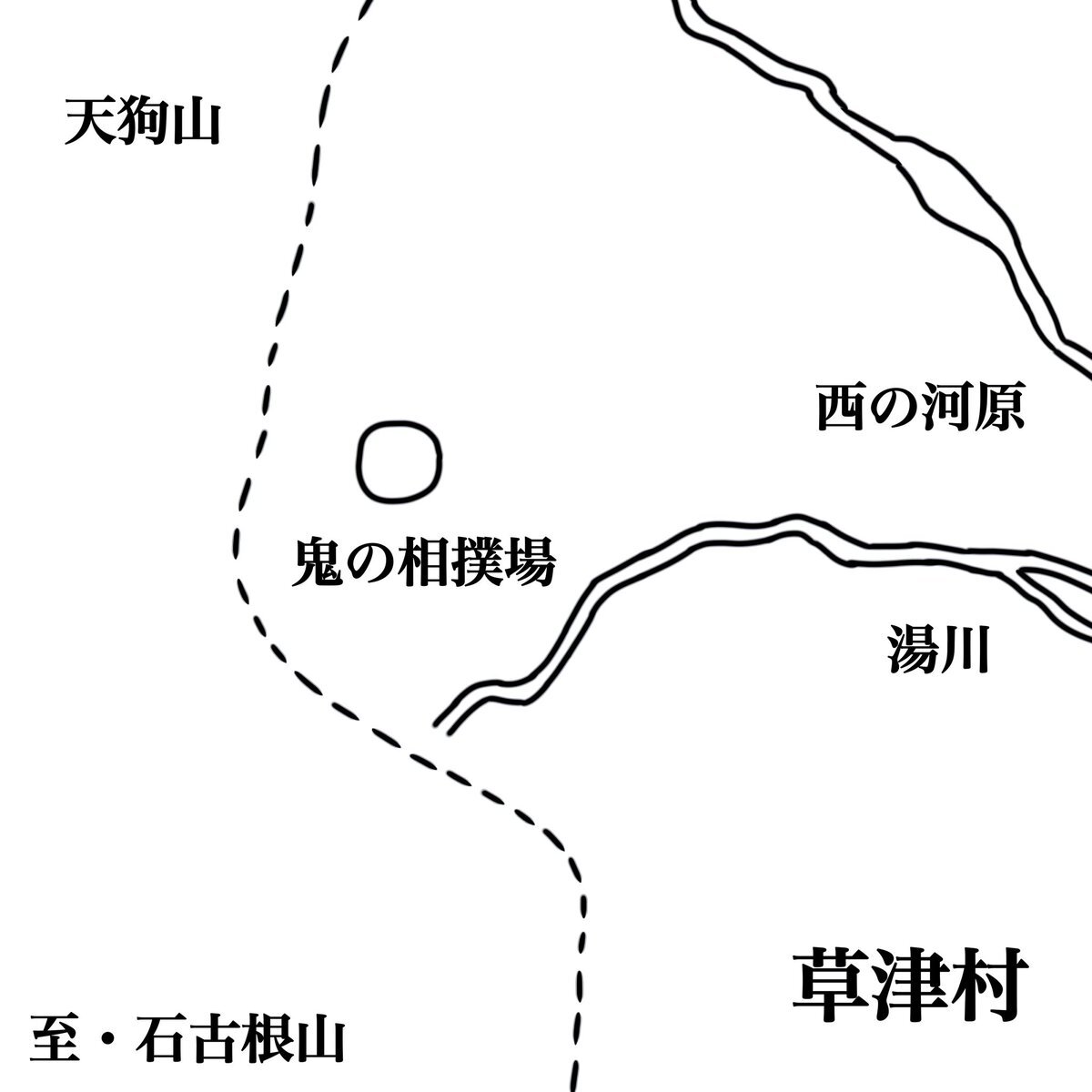 鬼の相撲場、周辺マップ。 天狗山は名前の通り、天狗👺、石古根山は鬼👹の住む山。ちなみに草津の河童の話は聞いたことないから、河童はいないと思ってる。強酸性とお湯のせい? #草津温泉 #西の河原 #鬼の相撲場 pic.x.com/FaQcv9Lcav