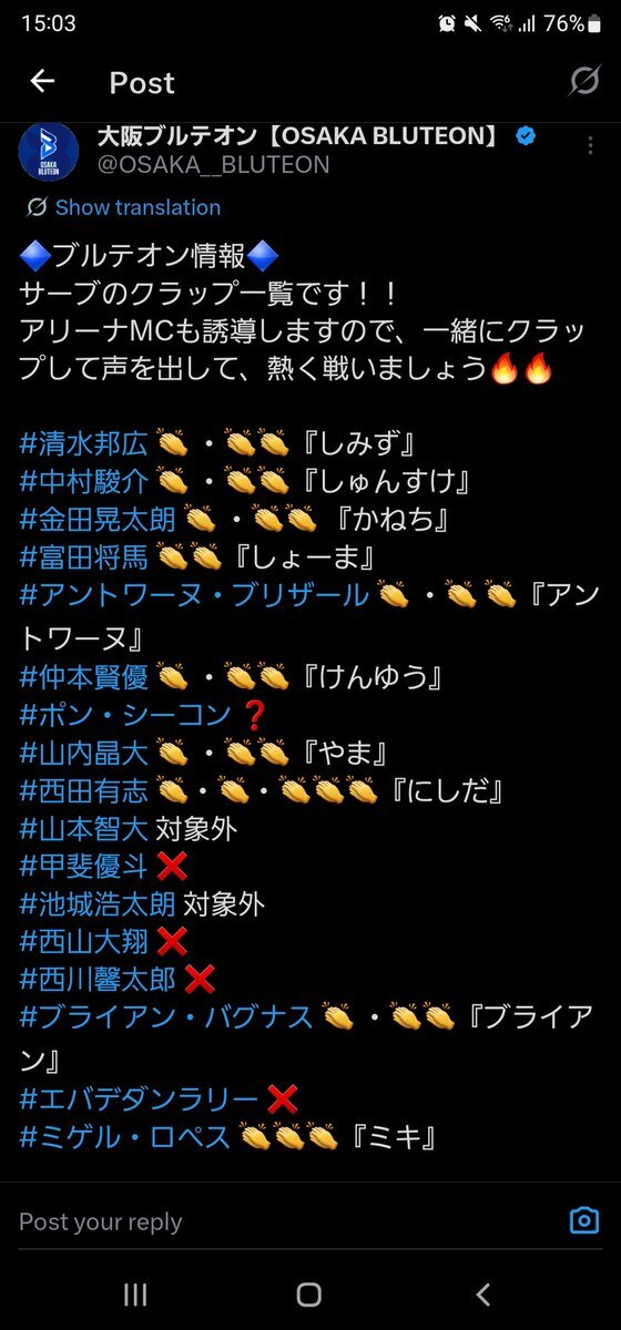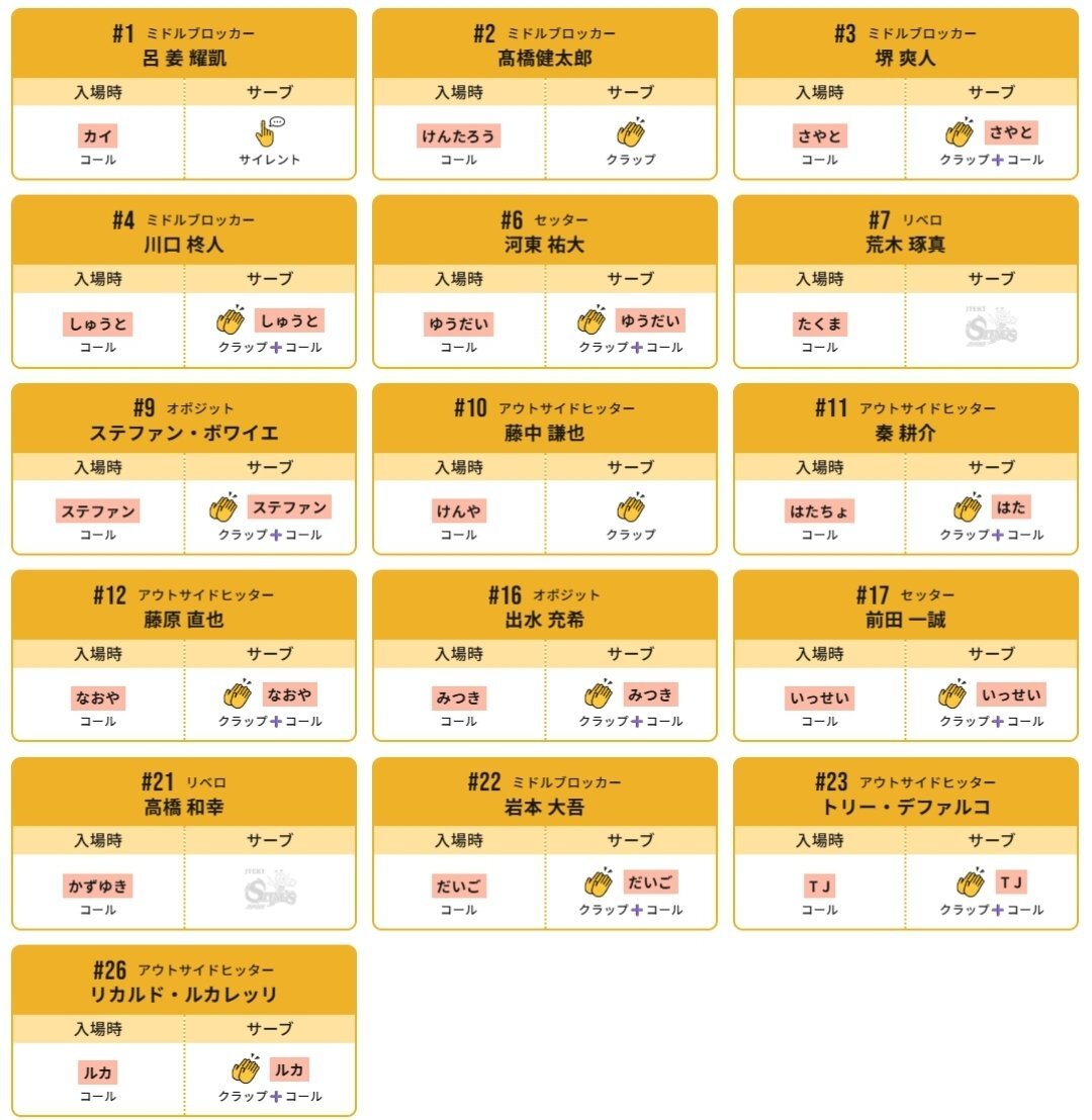 #小野寺太志 「たいし」👏👏 #佐藤謙次 👏(連打) #下川諒 「しーも」👏👏 #アライン 「AJ」👏👏 #関田誠大 ? #小川智大 リベロ #藤中颯志 リベロ #高橋藍 「らーん」👏👏 #ムセルスキー 🤫 #鬼木錬 「おにき」👏👏 #喜入祥充 「きりえ」👏👏 #サントリーサンバーズ大阪 pic.x.com/xX4rLu2z1x