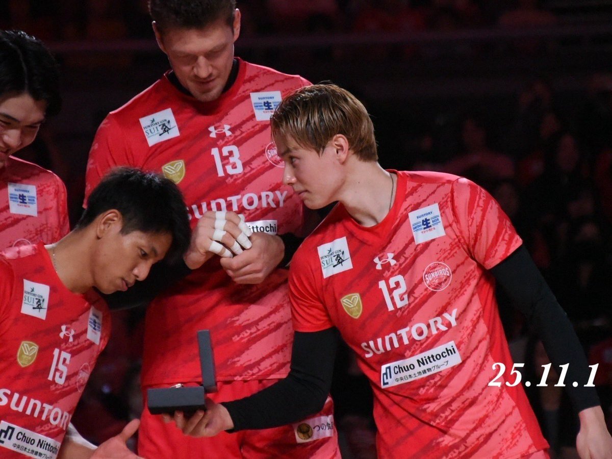 25.11.1 サントリー-東京GB@Asueアリーナ🐦🔥✨️ チャンピオンリング贈呈式👑✨️ みんなのぞきこんで見てたな👀✨ ファンにはレプリカくれんやろか🤔?✨️(某野球⚾️チームのは複数あるけど) #髙橋藍 #喜入祥充 #ドミトリー・ムセルスキー #鬼木錬 #サントリーサンバーズ大阪 #20251101 pic.x.com/gedmvFrm5s