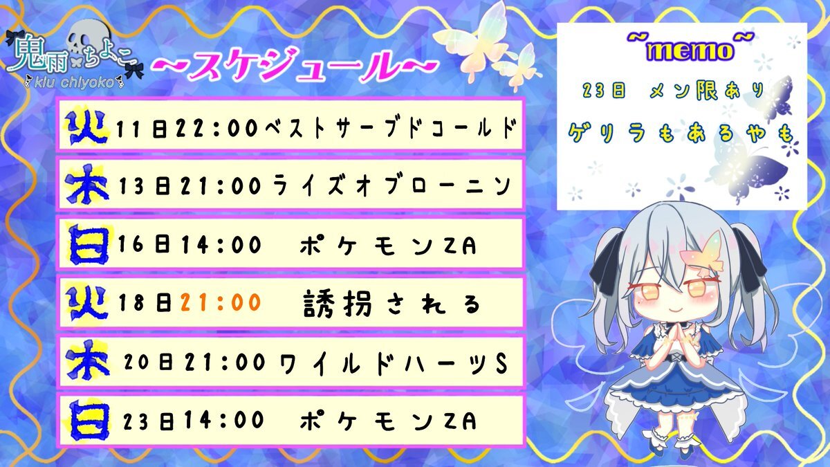 おはようのスケジュール🦋デデドン ローニンと獣狩はマスト🫶😏 人外に誘拐されたりゲリラもあったりします✨ポケモンも楽しみだ〜🥰🥰 寒くなりましたが体調第一に😌 鬼雨とまったり遊びませう〜🙌🙌🙌 #鬼雨のエデン pic.x.com/qZbnWNlBQi