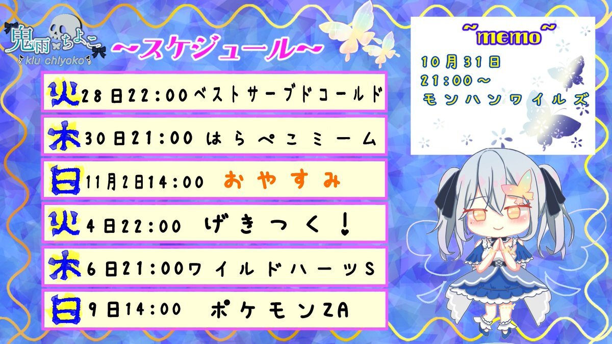 #鬼雨のエデン スケジュールです〜🦋デデドン 日曜日おやすみもらってます!!🙇♀️ げきつく!はクリア後のおまけ遊んだりなんやかんやするので復習しておいてくださいまし🫶💕 ハロウィンはモンハンしませう⚔️ pic.x.com/bn1A2usiTO