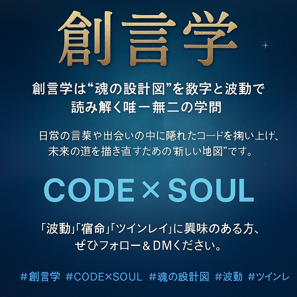 創言学 ― CODE×SOUL 魂の設計図を映し出す唯一無二の学問。 日常の出会い、言葉、自然のサインの中に隠された「コード」を掬い上げ、 波動と数字で未来の道を描き直す。 宿命は変えられる。 そして魂は進化する。 興味ある方はフォロー&DM📩 #魂の設計図 #波動 #ツインレイ #スピリチュアル #自己探求 pic.x.com/nM9ObD3D2Z