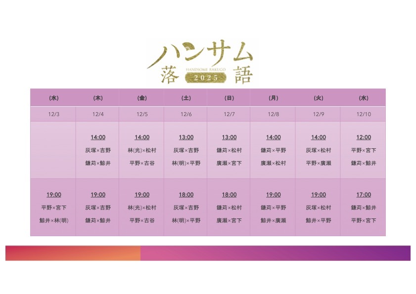 #ハンサム落語2025 公演決定! 2025/12/3(水)〜10(水) 浅草花劇場 出演 #鎌苅健太 #鯨井康介 #灰塚宗史 #林明寛 #林光哲 #平野良 #廣瀬智紀 #松村龍之介 #宮下雄也 #吉野俊矢 他 組み合わせ、チケット発売につきましては近日発表!お楽しみに! #ハン落