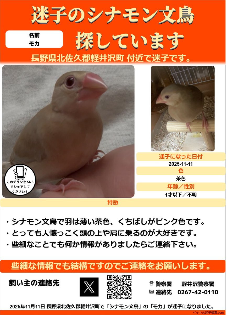 以下内容をSNSで拡散させていただきました。 maigokensaku.com/community/topi… 勝手ではございますがチラシを作成させていただきました。 ↓こちらのような感じでチラシを利用していただくと有効かと思います。 maigokensaku.com/flyer #迷子 #鳥 #迷い鳥 #迷い文鳥 #長野県 #シナモン文鳥 pic.x.com/PhffhjwVRQ