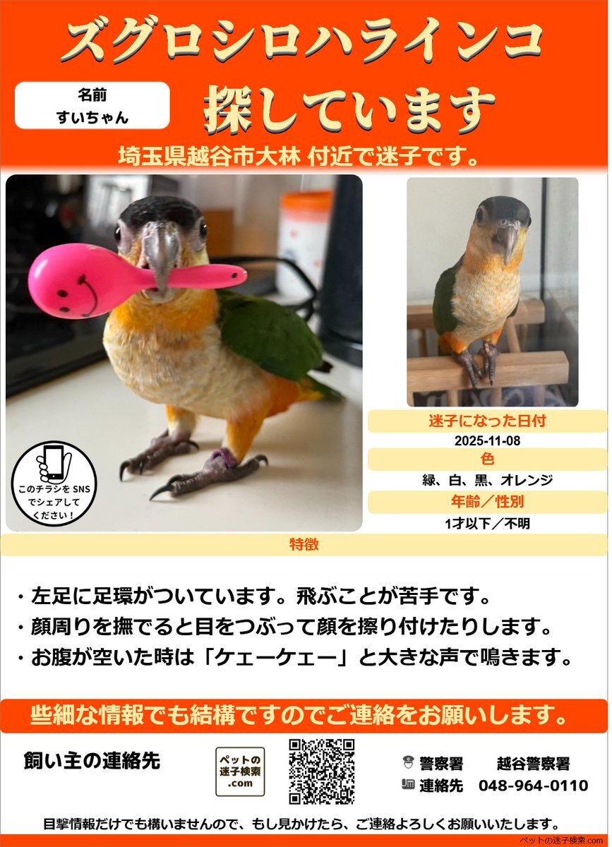 迷子情報が登録されました。 [詳細はこちら↓] maigokensaku.com/community/topi… 2025年11月8日 埼玉県越谷市大林で「ズグロシロハラインコ」の「すいちゃん」が迷子になりました。 発見、保護されましたらご連絡をお願いいたします。 #迷子 #鳥 #迷い鳥 #迷いインコ #埼玉県 #ズグロシロハラインコ
