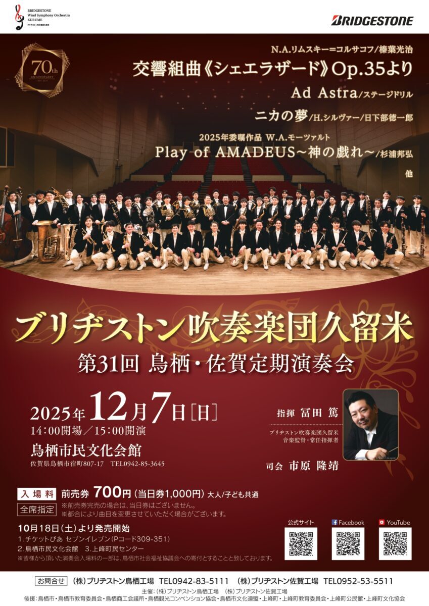 【アート&カルチャー】(株)#ブリヂストン「#ブリヂストン吹奏楽団久留米 第31回鳥栖・佐賀定期演奏会」12/7(日) 15時~ #鳥栖市民文化会館(佐賀) arts.mecenat.or.jp/events/22290.h… 2025年に創設70周年を迎えたブリヂストン吹奏楽団久留米、70周年の集大成の演奏会を鳥栖で開催 #冨田篤 #市原隆靖 #企業メセナ pic.x.com/WAhBpGHAN7